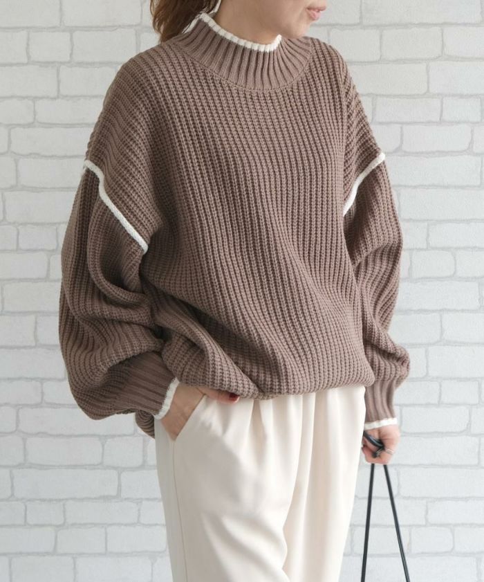• バイカラーデザインが目を惹くモックネックニットトップス