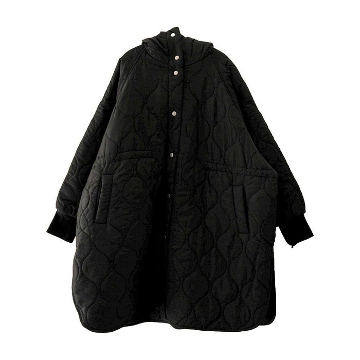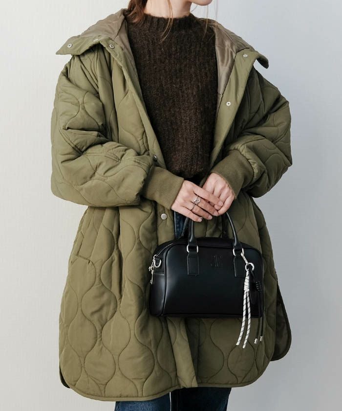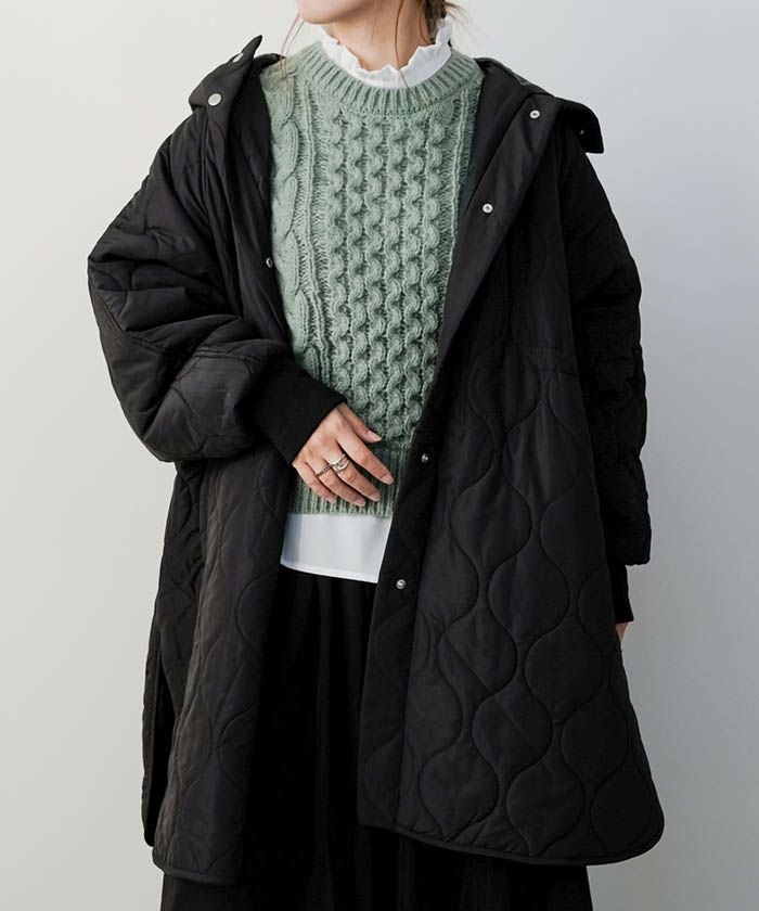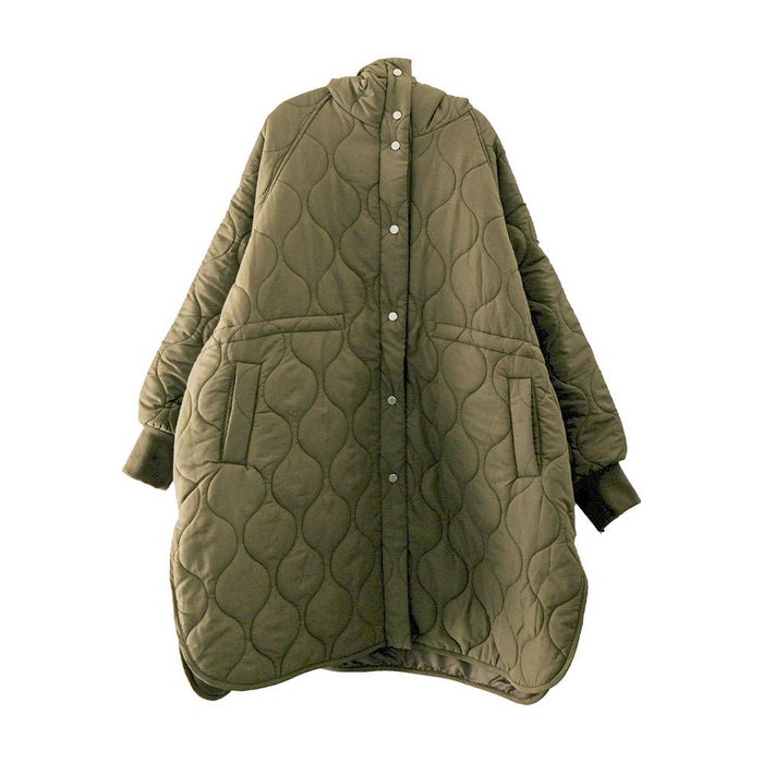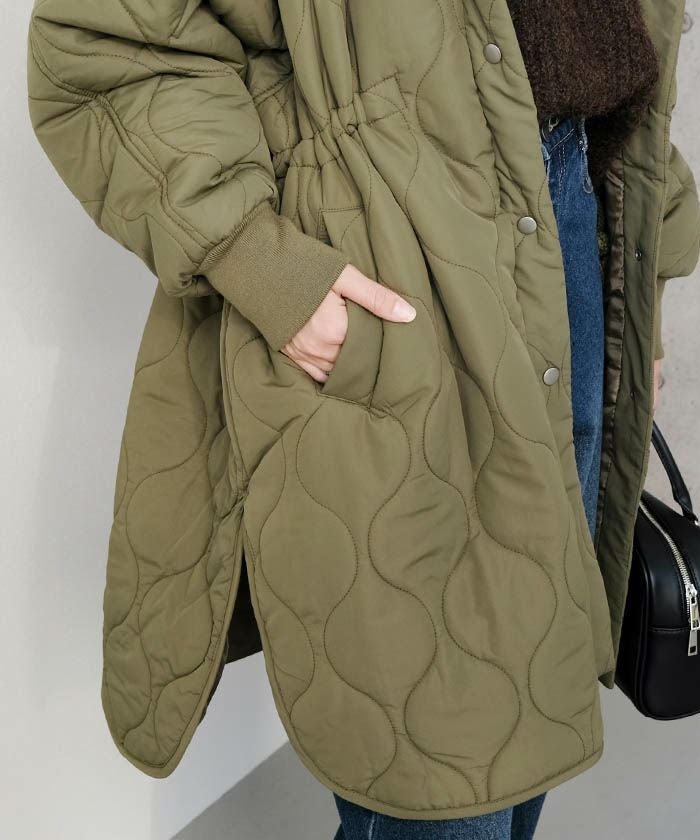 ふんわりとした中綿入りの軽やかなキルティング素材を使用した、ロング丈のドロストコート。