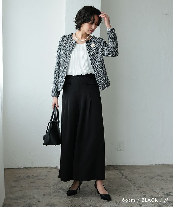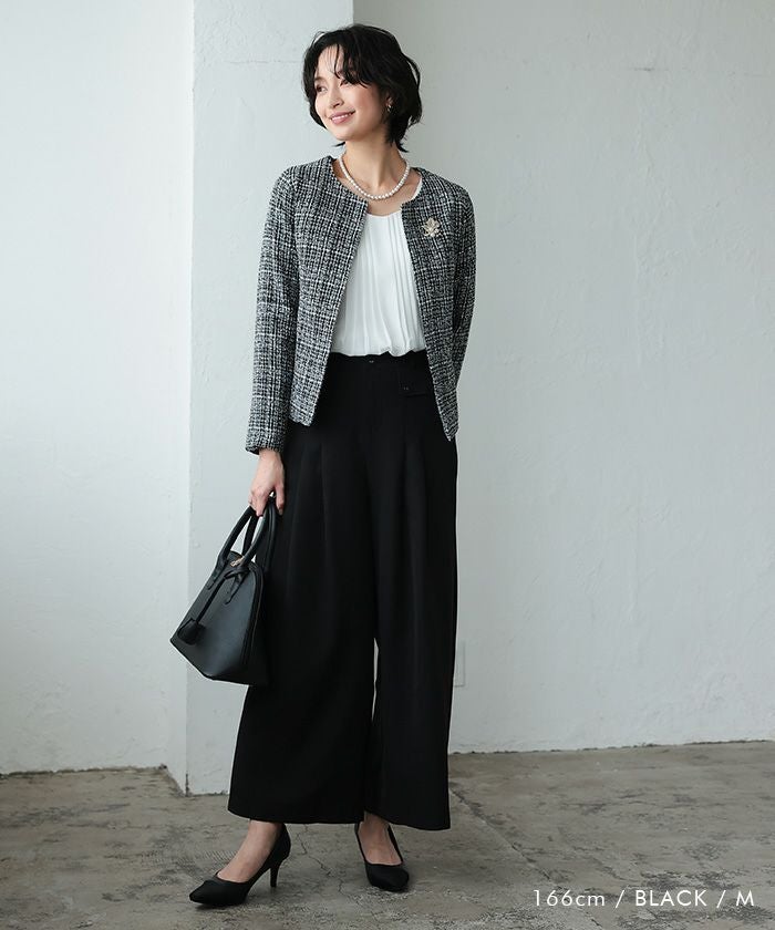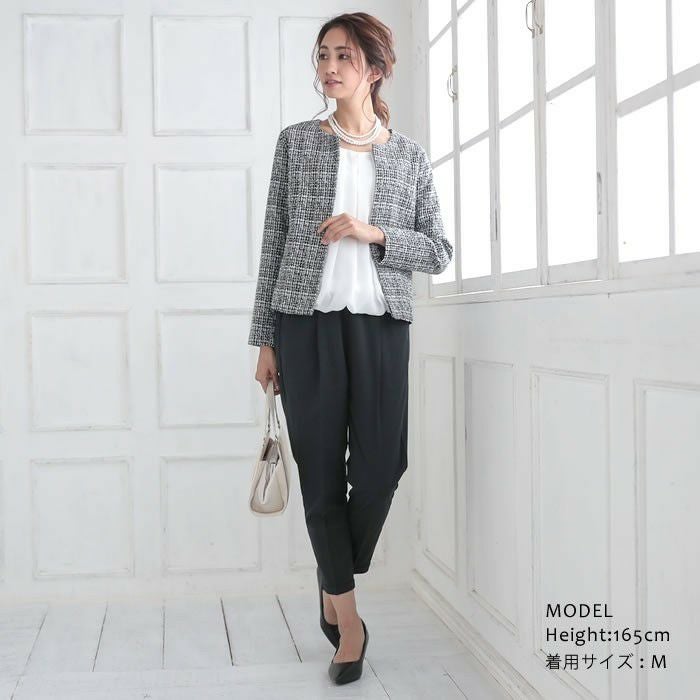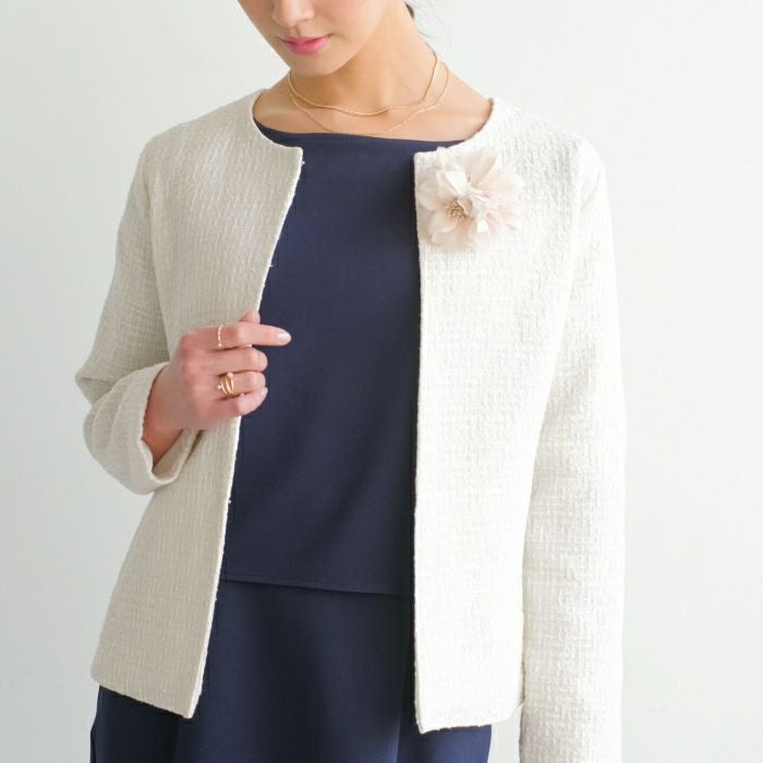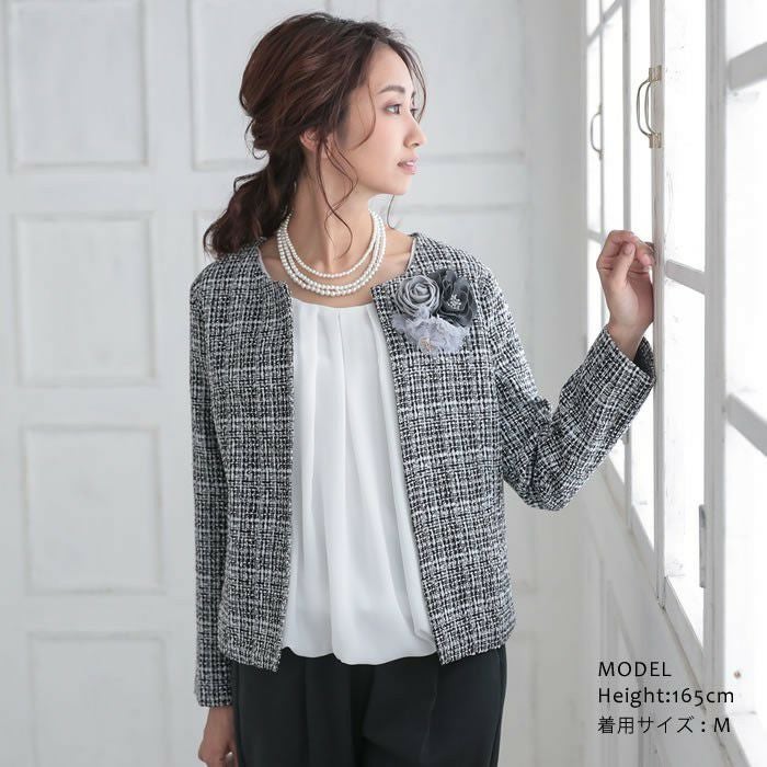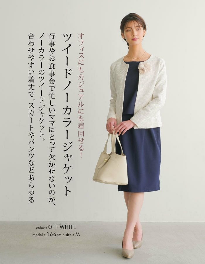 行事やお食事会で忙しいママにとって欠かせないのが、ノーカラーのツイードジャケット。