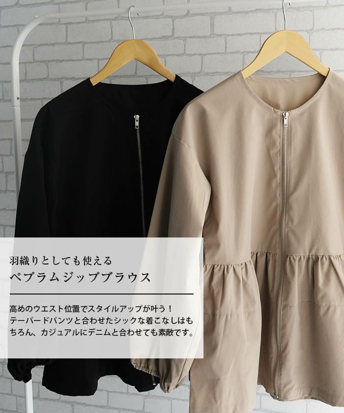 • 軽くてハリがある素材でサラっと羽織りとしても使えるペプラムジップブラウス
