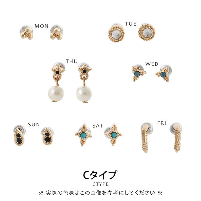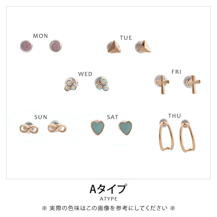• 小ぶりなデザインが可愛い、一週間分がセットになったピアス。