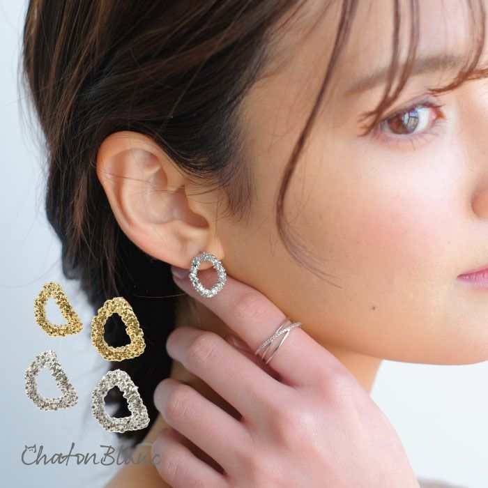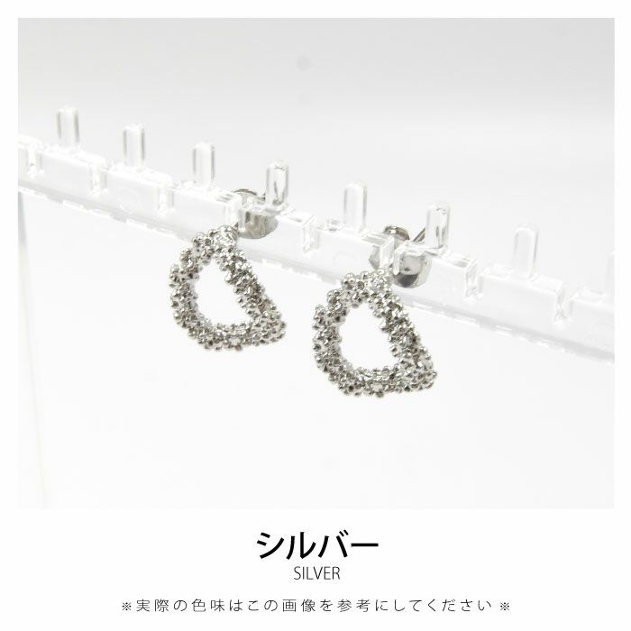光を受けて煌めく小さな粒を集めたようなモチーフが存在感を放ちます。 程よい輝きを放つ個性的なシルエットは大人コーデのアクセント使いにも◎