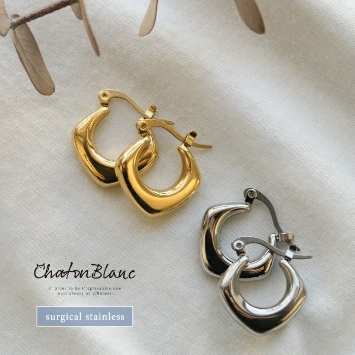 • スクエアモチーフがモードな存在感を放つ!ステンレス製スクエアフープピアス