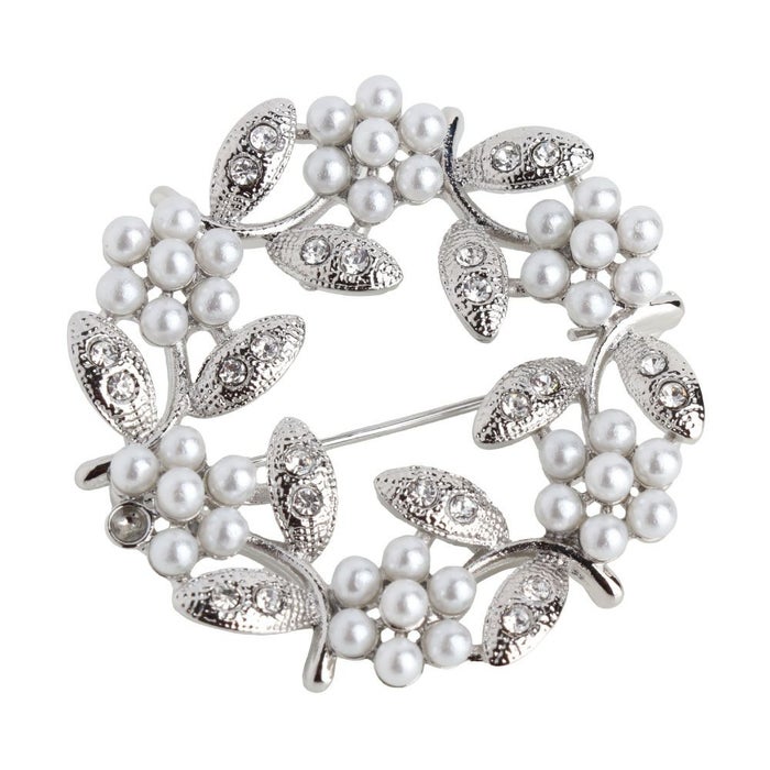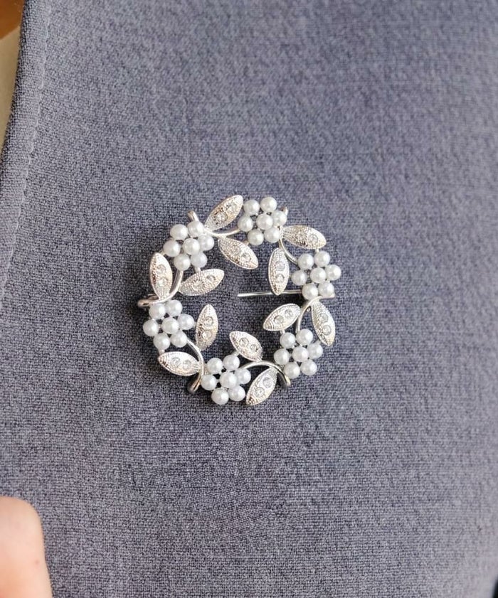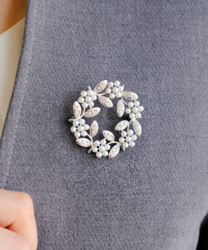 • パールやビジューをデコレーションしたサークル型ブローチ。