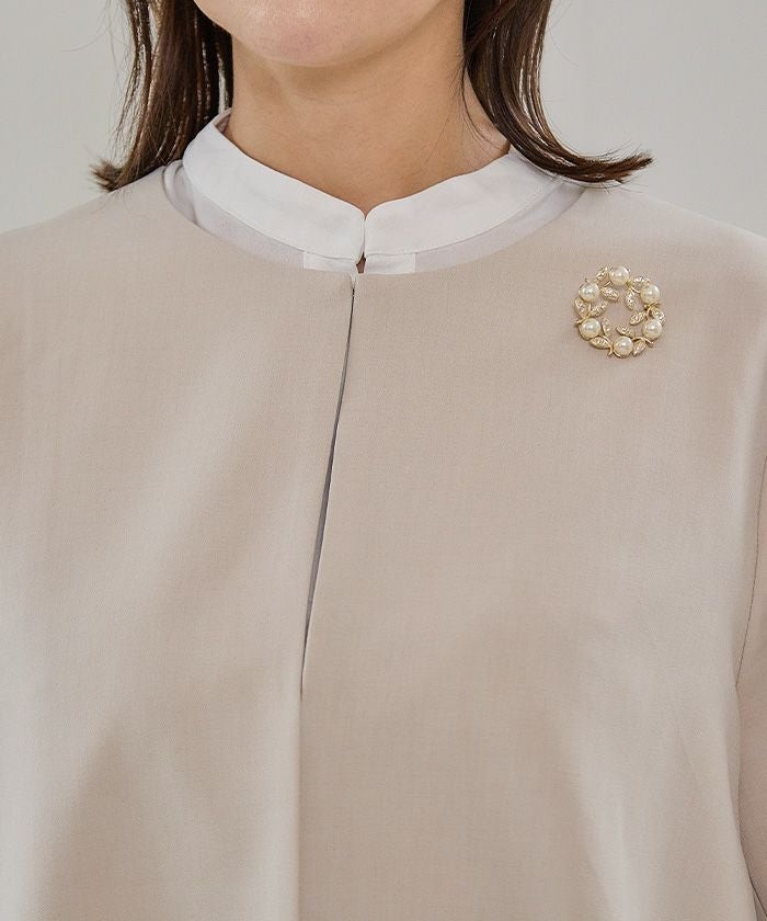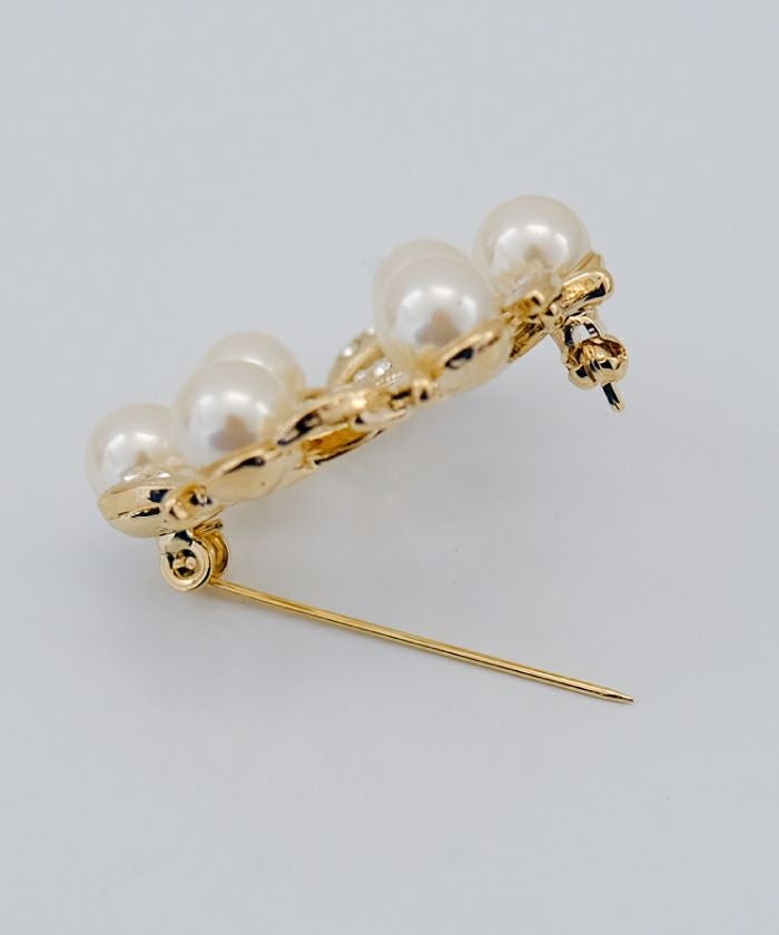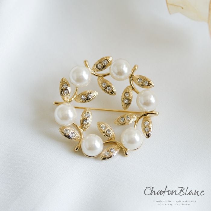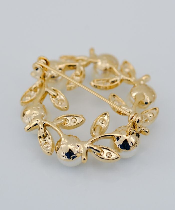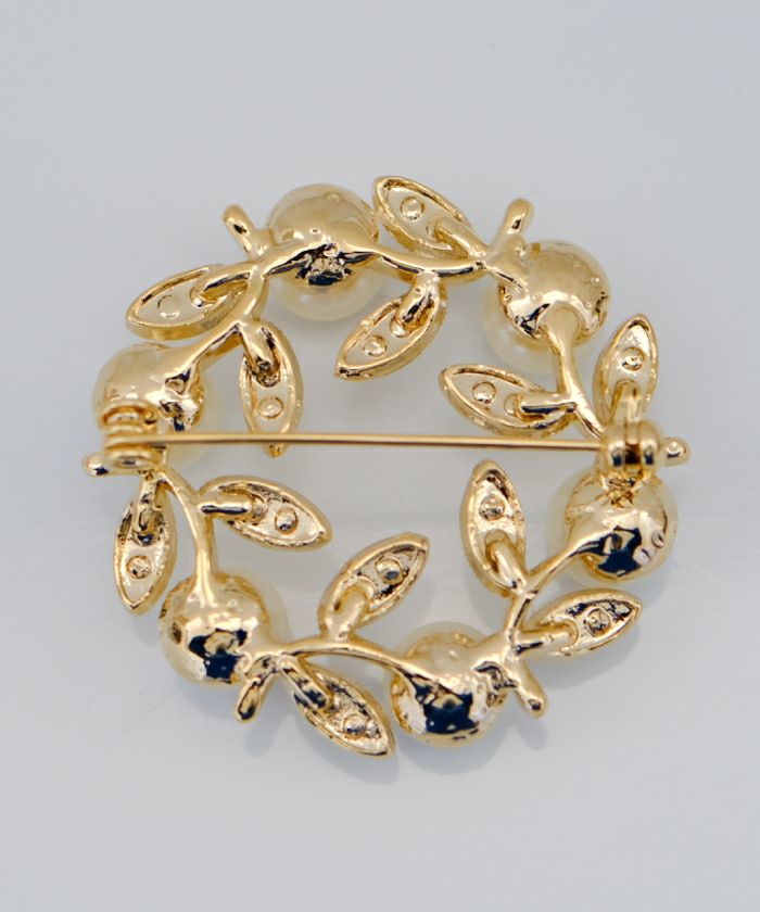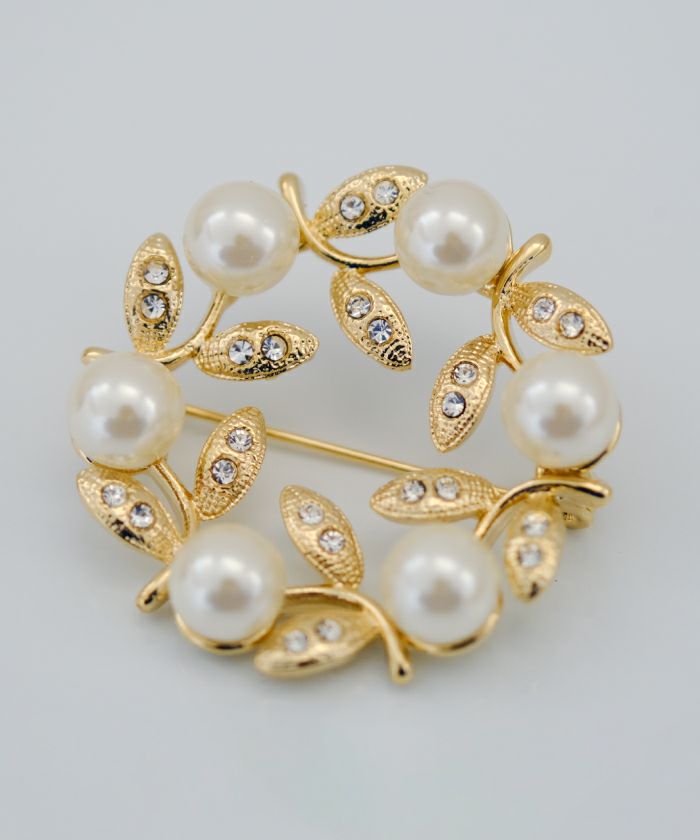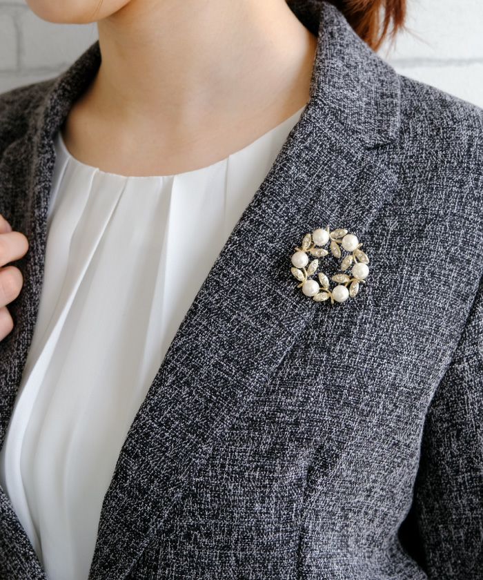 • パールやビジューをデコレーションしたサークル型ブローチ。