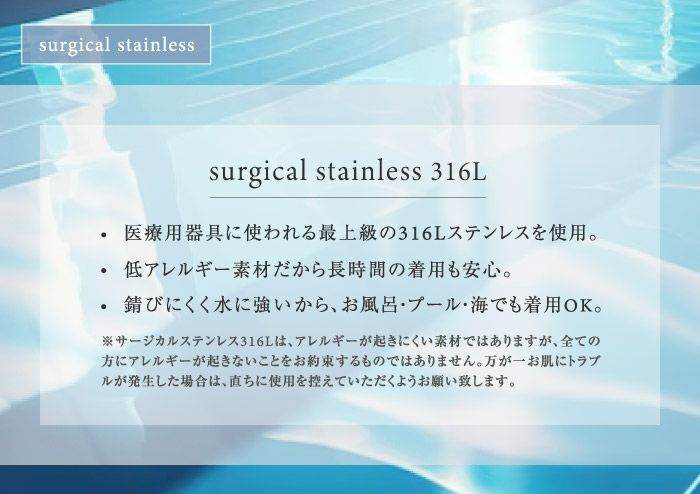 素材は金属アレルギーを起こしにくいサージカルステンレスを使用しており、金属アレルギーの方でも安心してご利用いただけます。