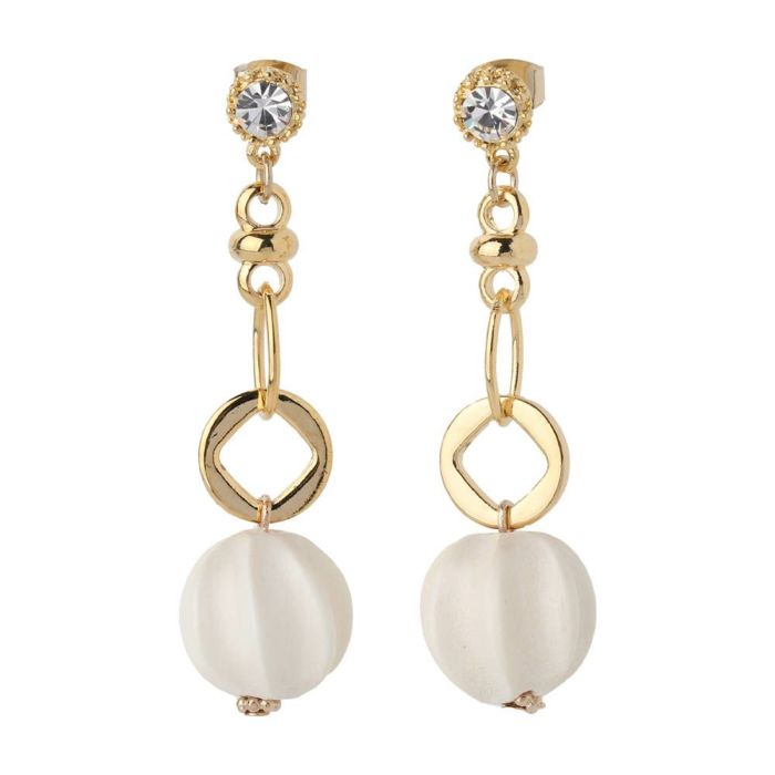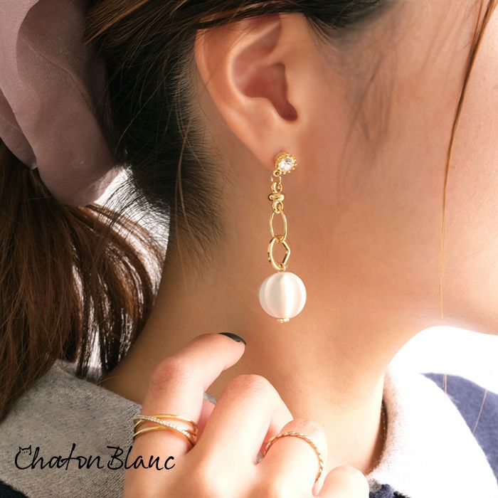 耳元でそっと揺れるしずく形のドロップモチーフが、やわらかく女性らしい印象を演出。