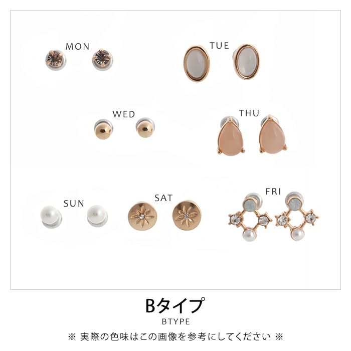 • 小ぶりなデザインが可愛い、一週間分がセットになったピアス。