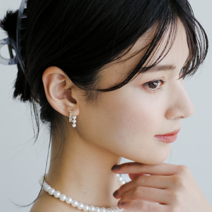 • 耳元に上品な輝きを添えてくれる。3連パールビジューバーピアス