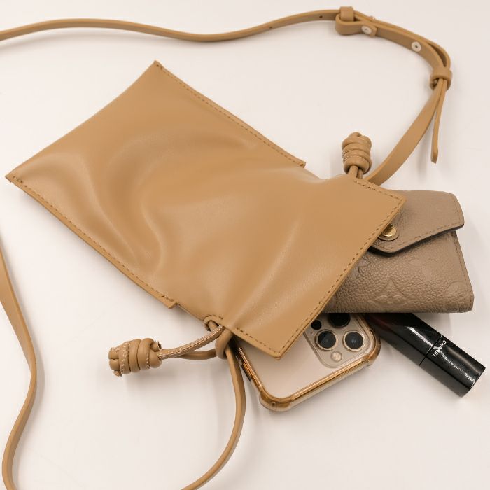 ちょっとそこまでにちょうどいい、スマホポシェット。 小さいながらもスマホやミニ財布などの必要最低限の荷物は収納可能。 手ぶらでスマートにお出かけができちゃいます。