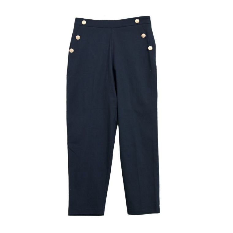 落ち感のあるコットン生地で穿き心地のいいパンツ。ゴールドボタンが腰位置を高く魅せてくれ、センタープレスとハイウエストデザインがスタイルアップ効果抜群。 脚のラインを拾わない程よいゆったり感で体型カバーにも◎