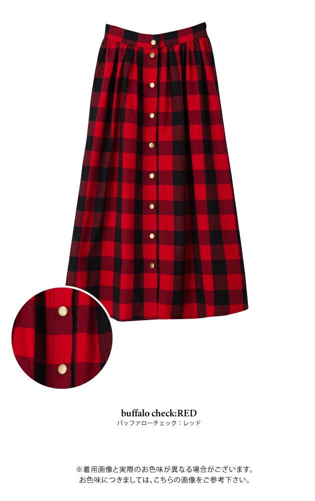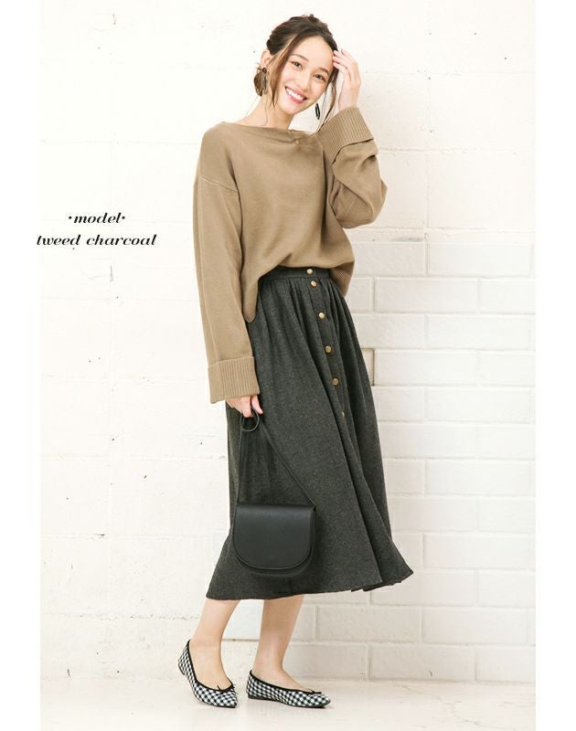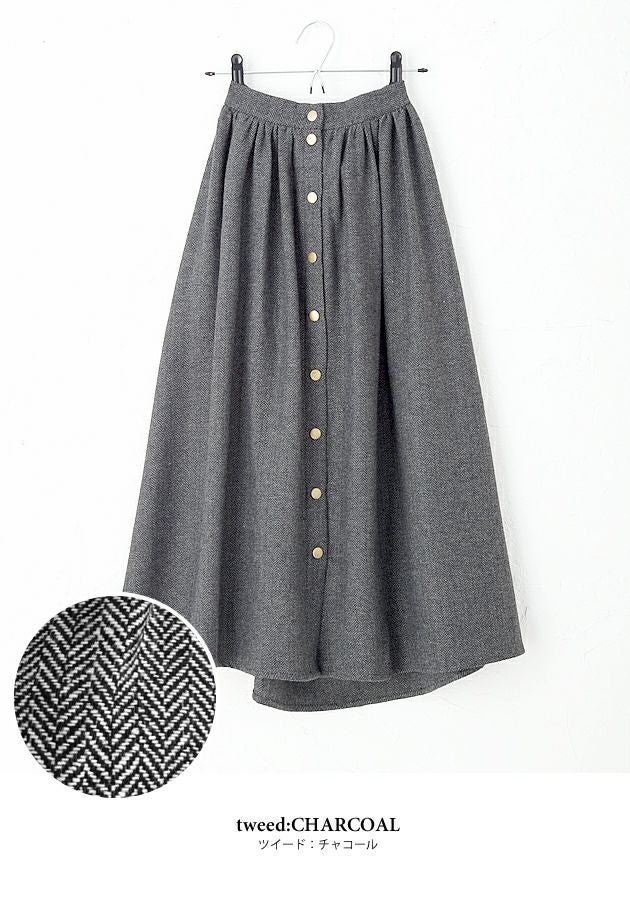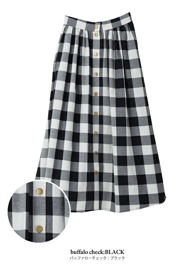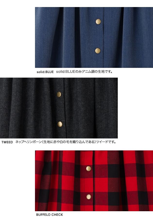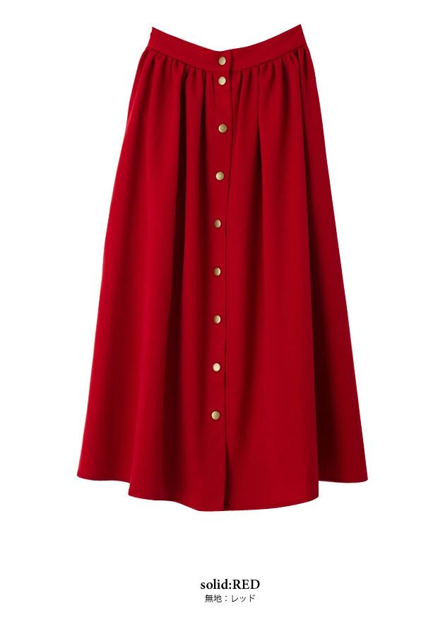 フロントスナップボタンがアクセントのタックフレアスカート。