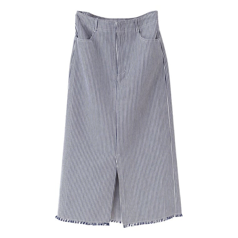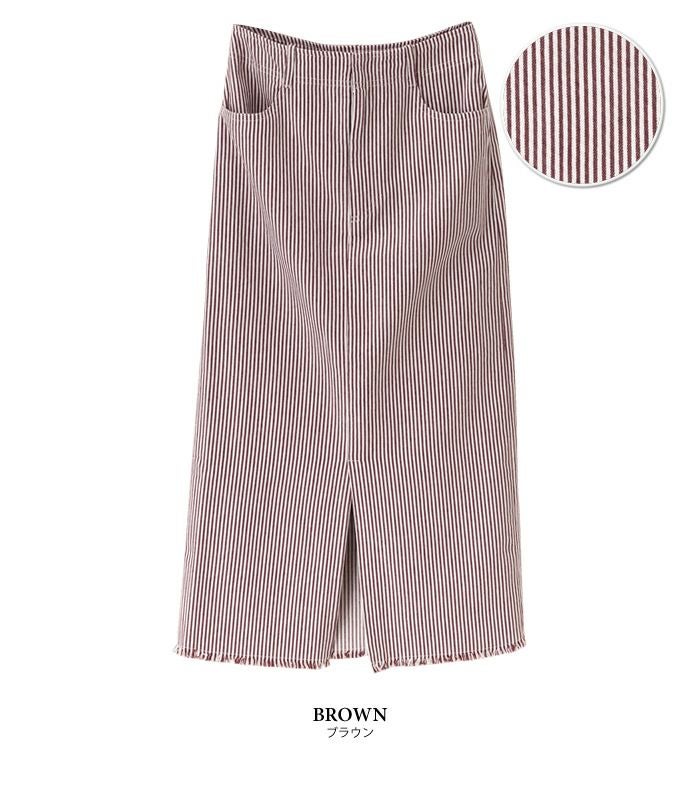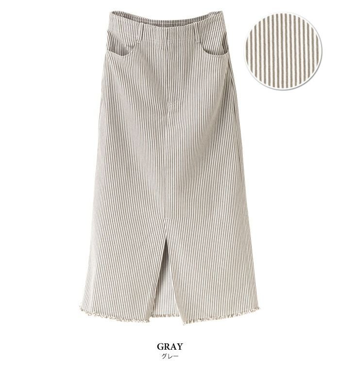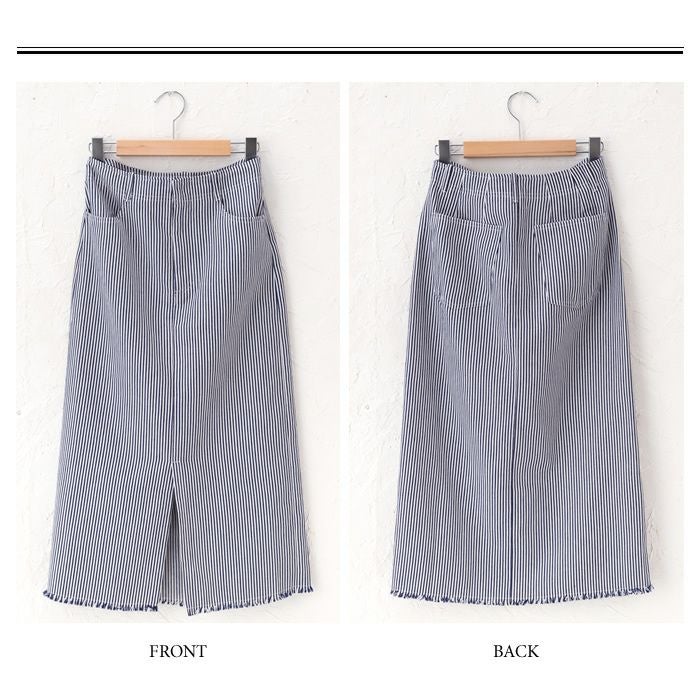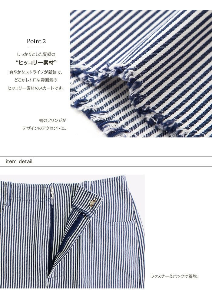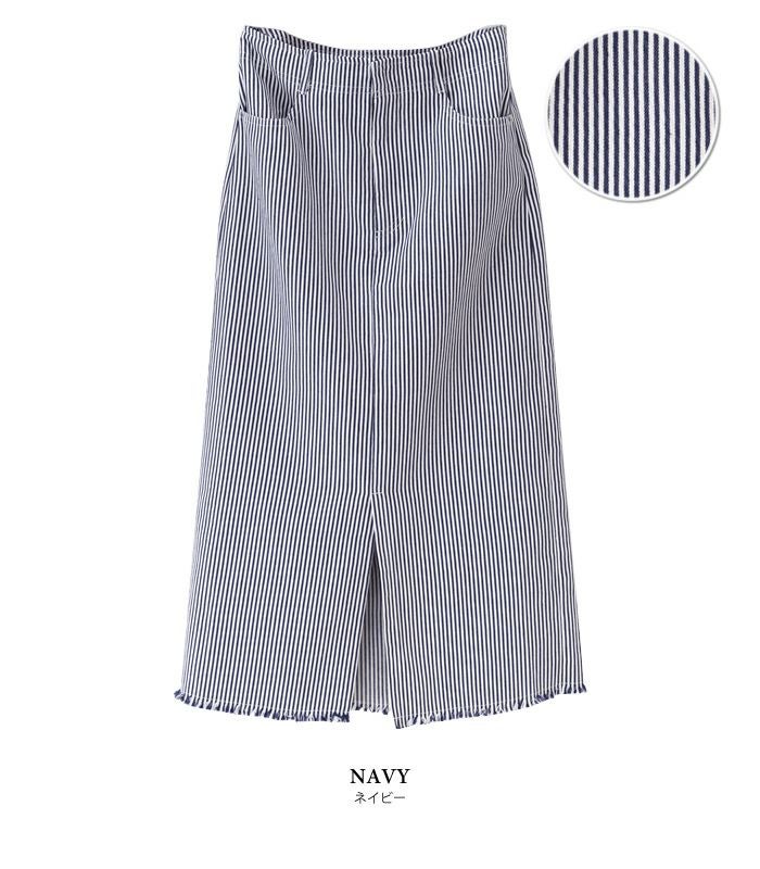 タイトスカート ハイウエスト ヒッコリー フロントスリット 裾フリンジ ヒッコリー素材 ヒッコリー柄 レトロ ヴィンテージ ストライプ カジュアル ひざ丈 ミディ丈 ミモレ丈 19_01wrsk■