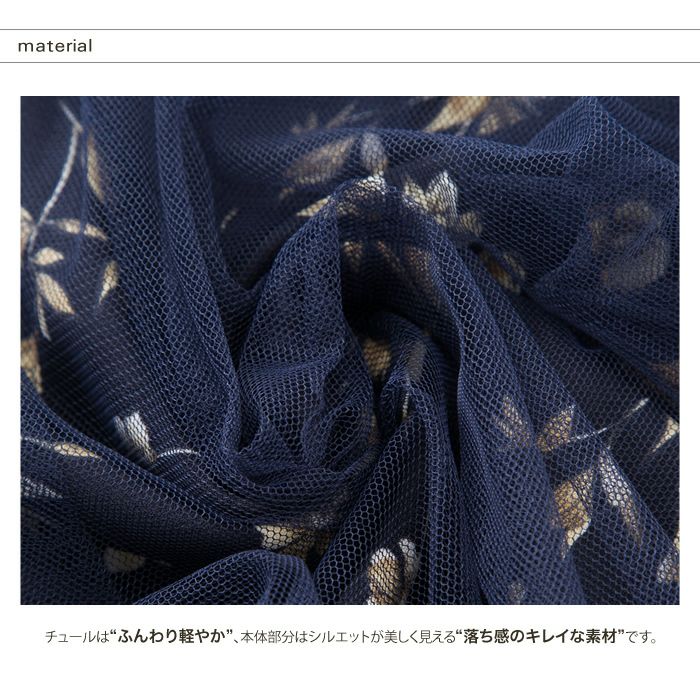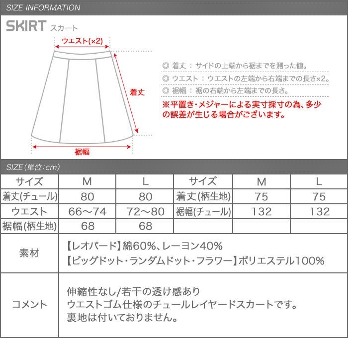 着丈(チュール):80cm 着丈(柄生地):75cm ウエスト:66cm~74cm 裾幅(チュール):132cm 裾幅(柄生地):68cm