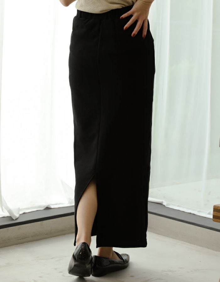 タイトなシルエットで、すっきり細見えするナロースカート。 深めのスリットで足さばきもよく脚を綺麗に見せてくれます。 ウエストはゴム仕様で、リラックス感のある穿き心地もポイント。 シンプルで着回しやすい、デイリーユースに活躍するアイテムです。