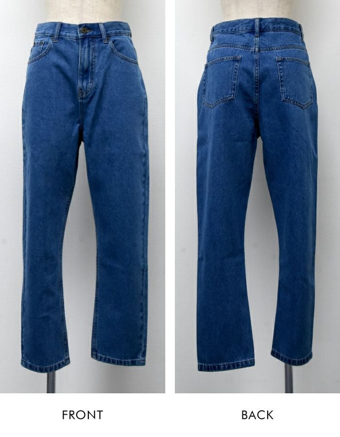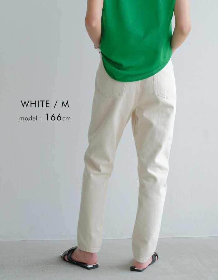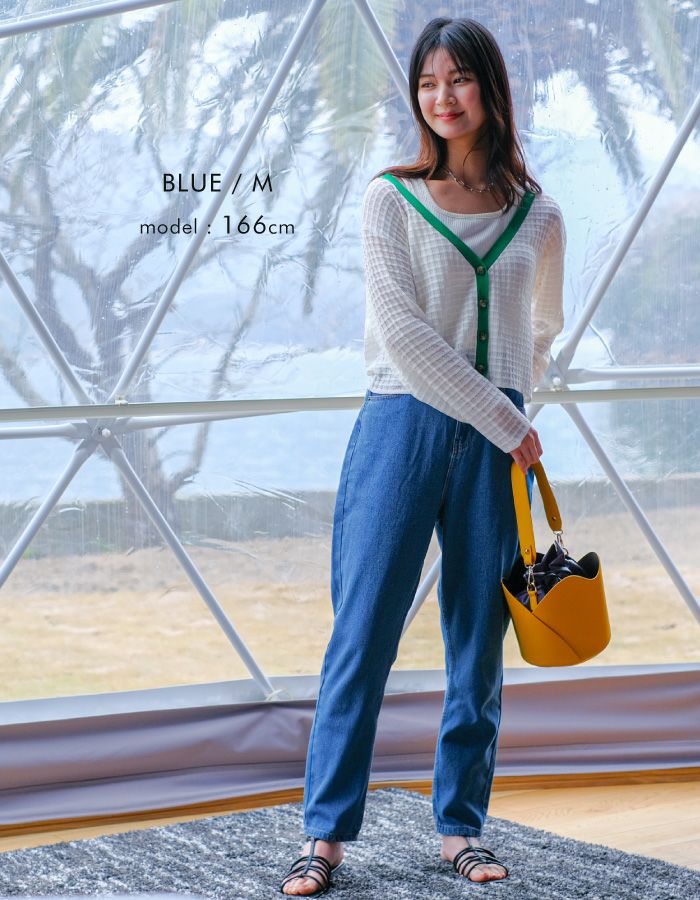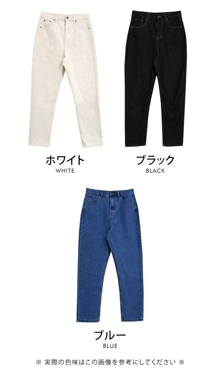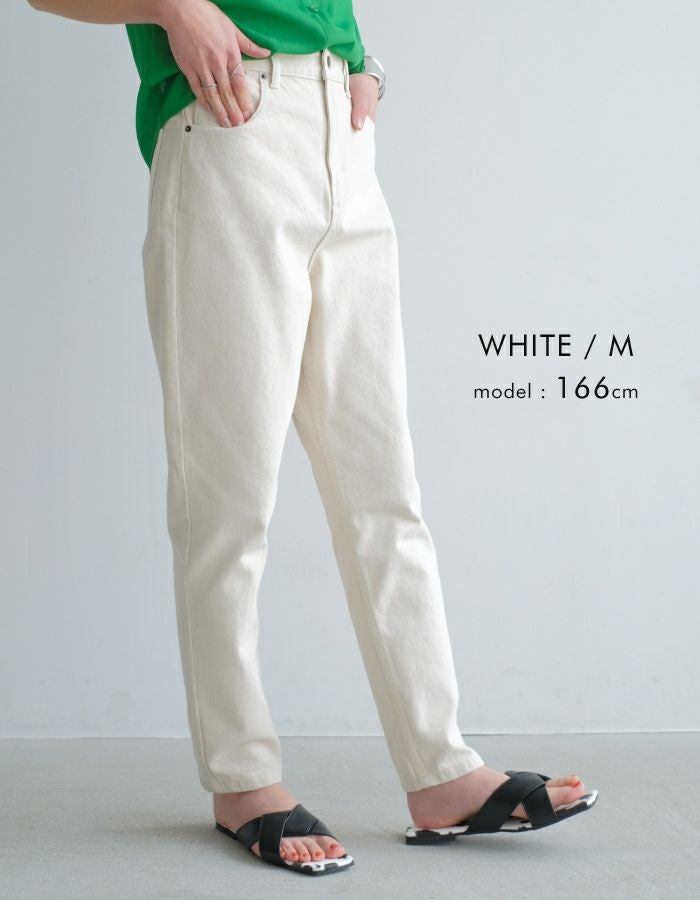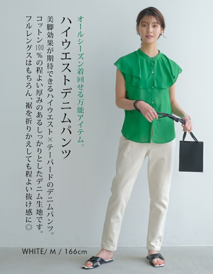 美脚効果が期待できるハイウエスト×テーパードのデニムパンツ。コットン100%の程よい厚みのあるしっかりとしたデニム生地です。フルレングスはもちろん、裾を折りかえしても程よい抜け感に◎