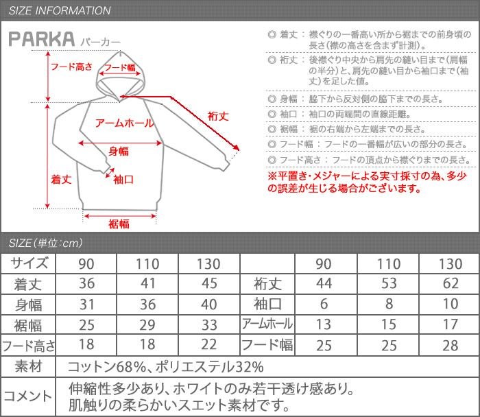 着丈:36cm 裄丈:44cm 身幅:31cm 袖口:6cm 裾幅:25cm アームホール:13cm フード高さ:18cm フード幅:25cm