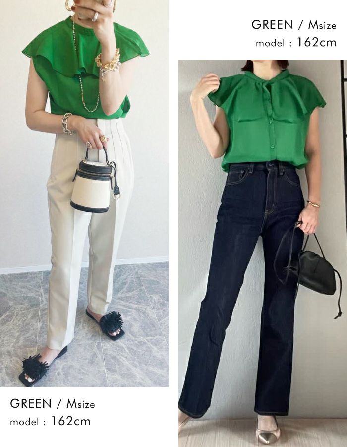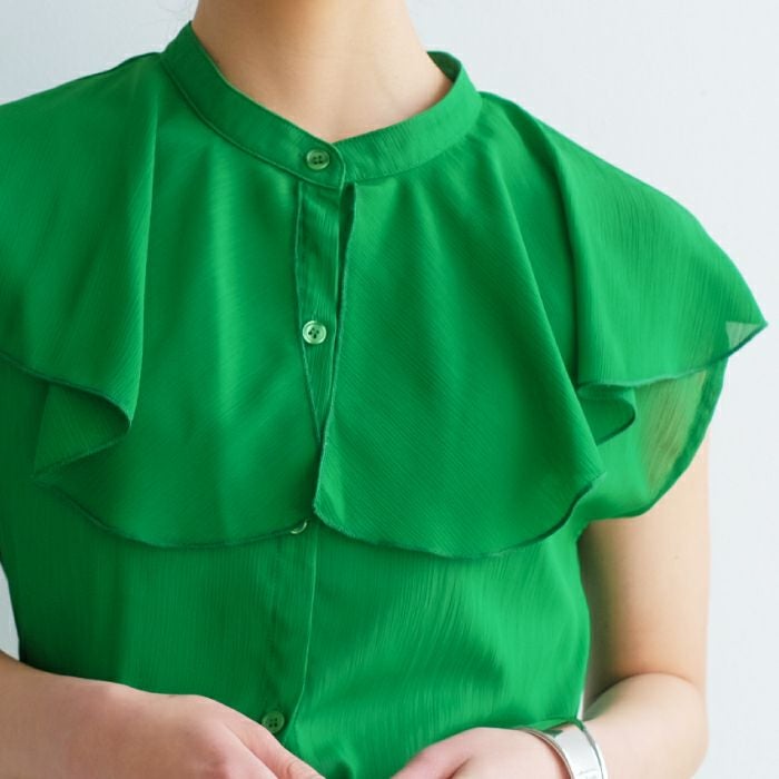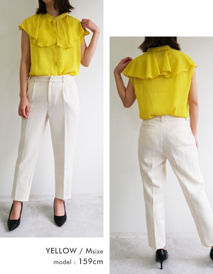 • 大きめなフリルで顔周り華やか。フリル襟ノースリーブブラウス