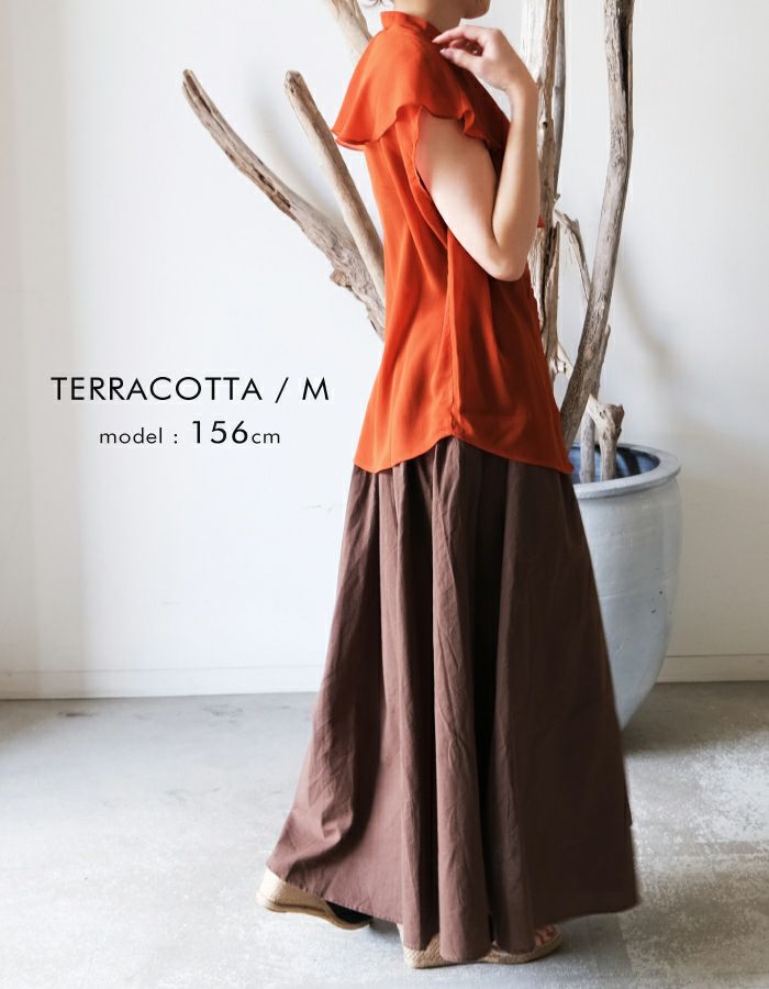 風合いのある涼しげな印象の綺麗見えノースリーブブラウス。大きいフリル襟は、肩先が隠れ気になる二の腕もカバーしてくれます。かっこよくパンツ合わせも、スカートと合わせフェミニンにも◎