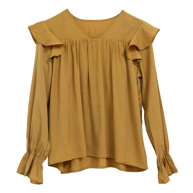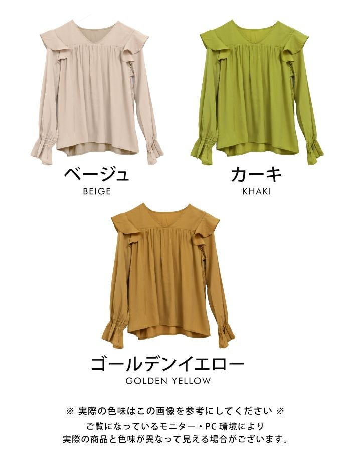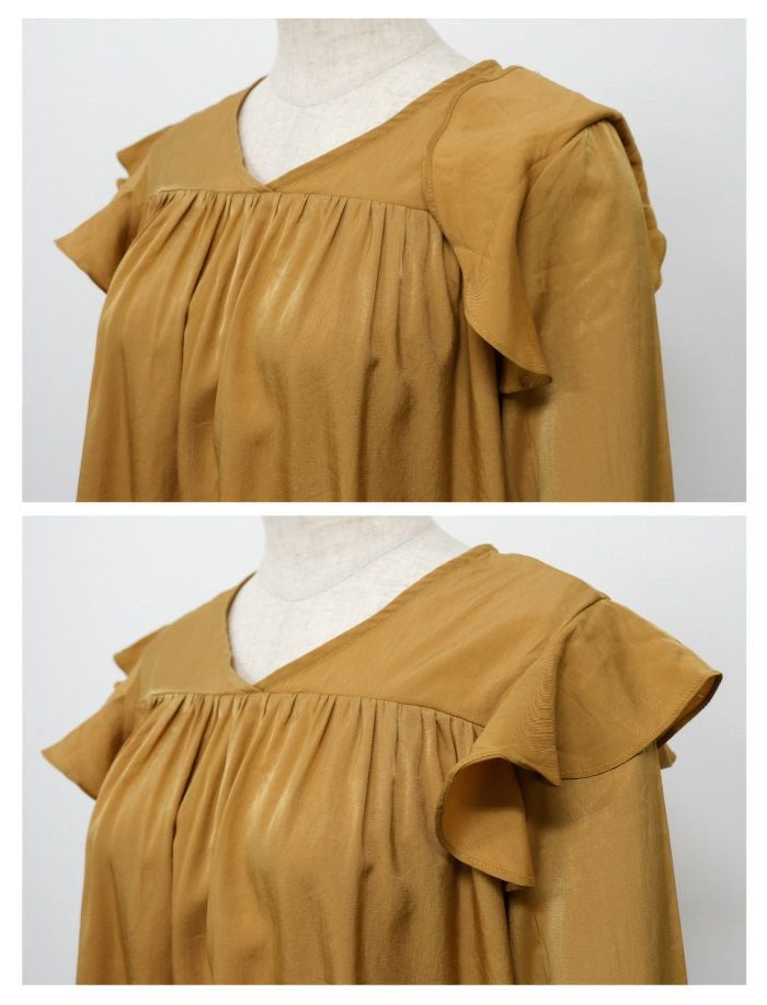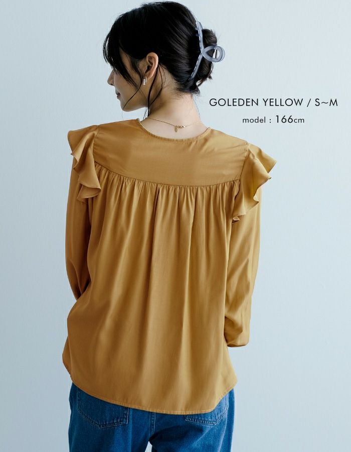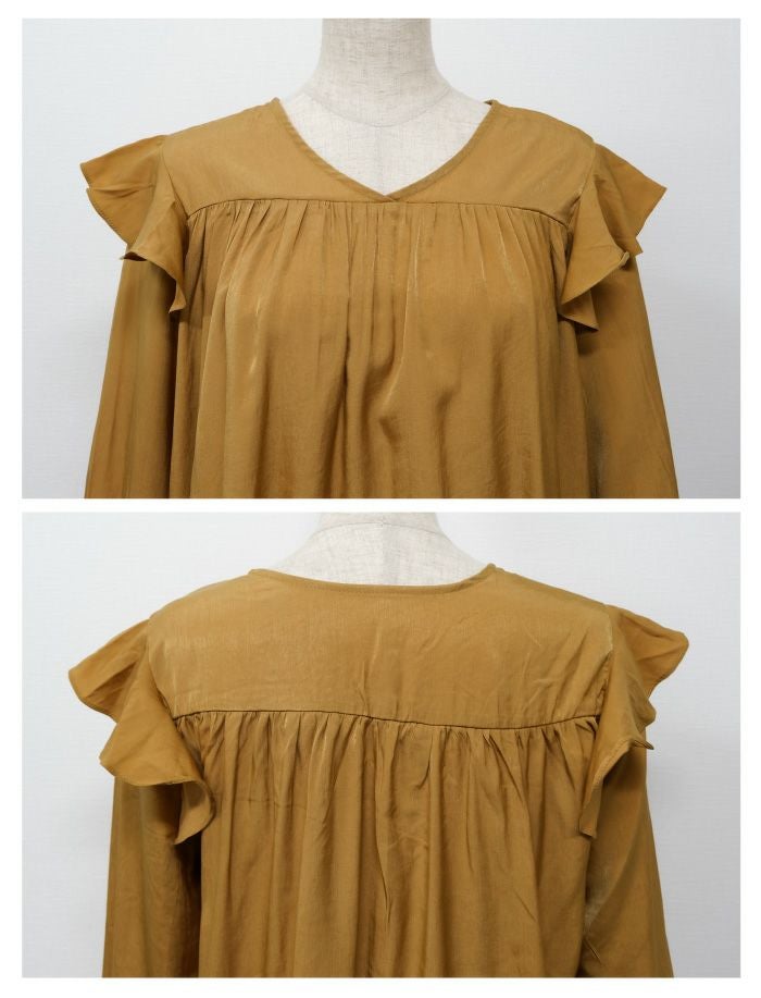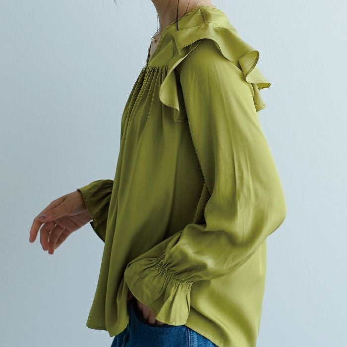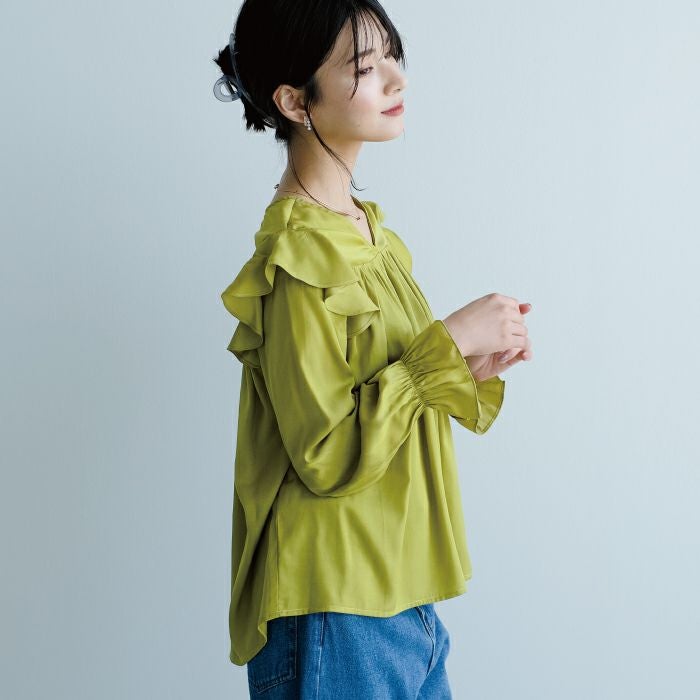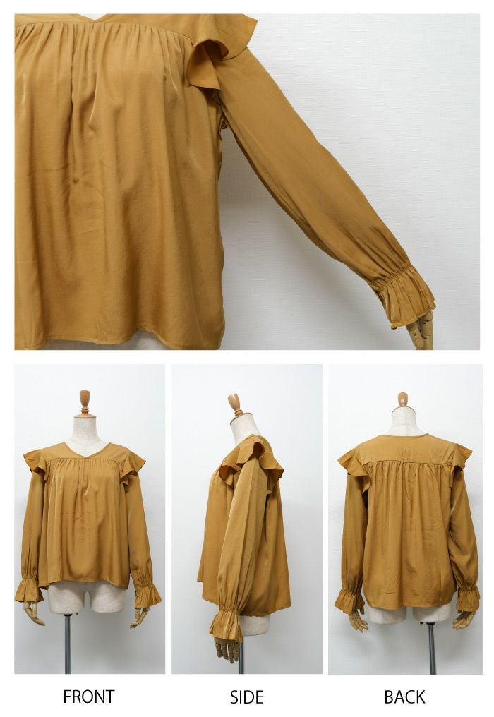 肩のフリルとキャンディースリーブが可愛いブラウス。 胸元からたっぷりギャザーが入ってふんわりとしたシルエットに。 光沢感のあるサテン調生地で、大人っぽく上品に着られます。