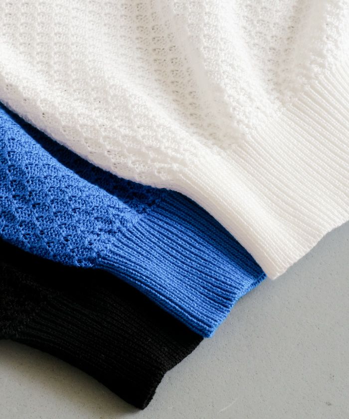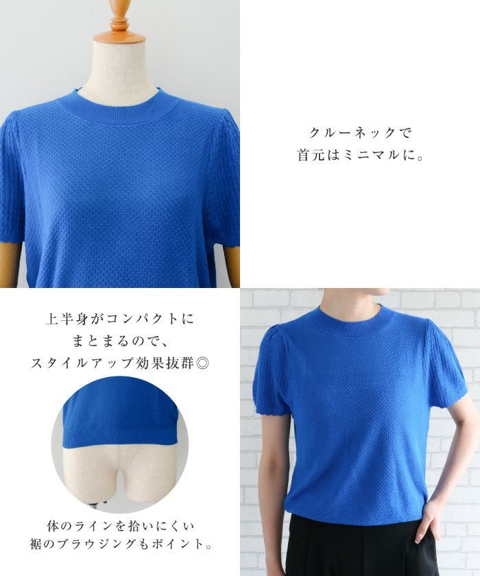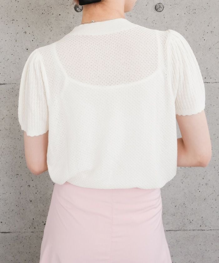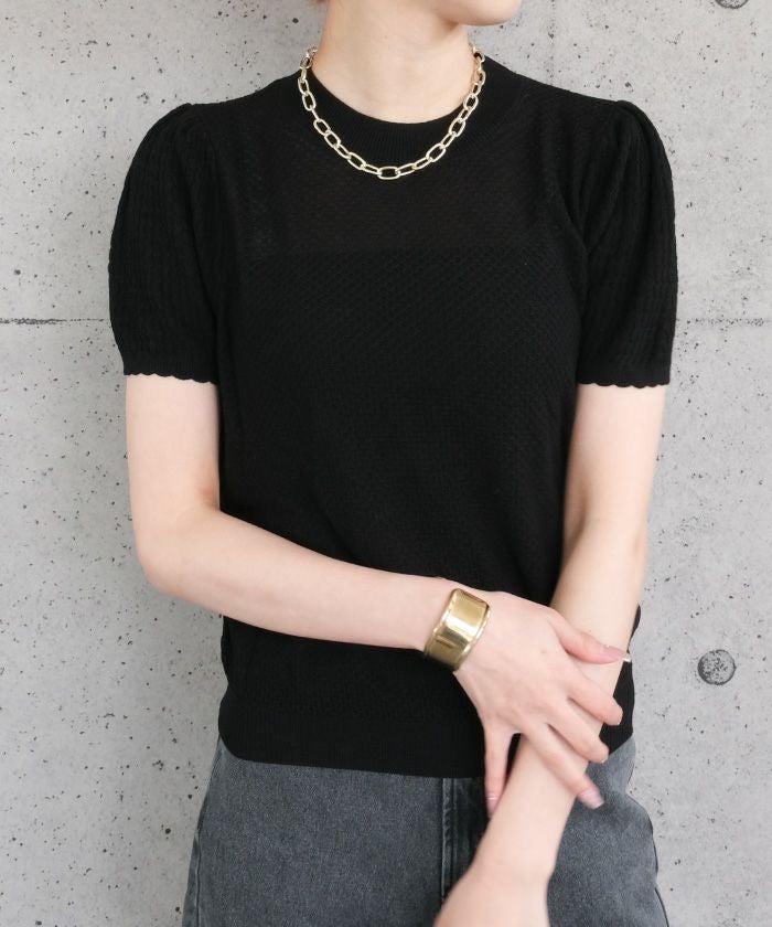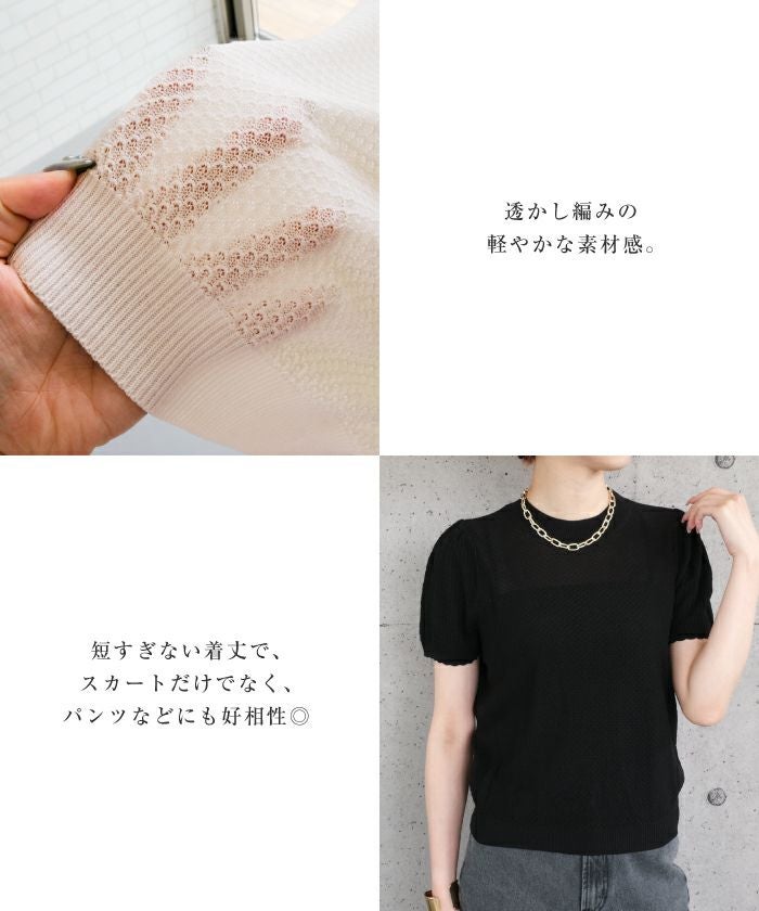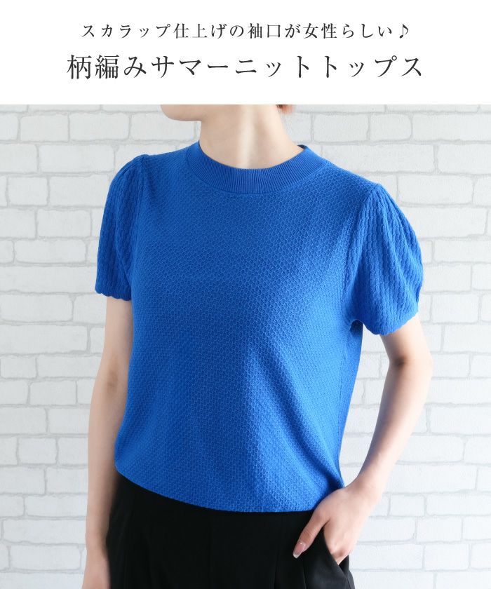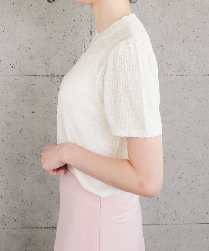 • スカラップ仕上げの袖口が女性らしい柄編みサマーニットトップス