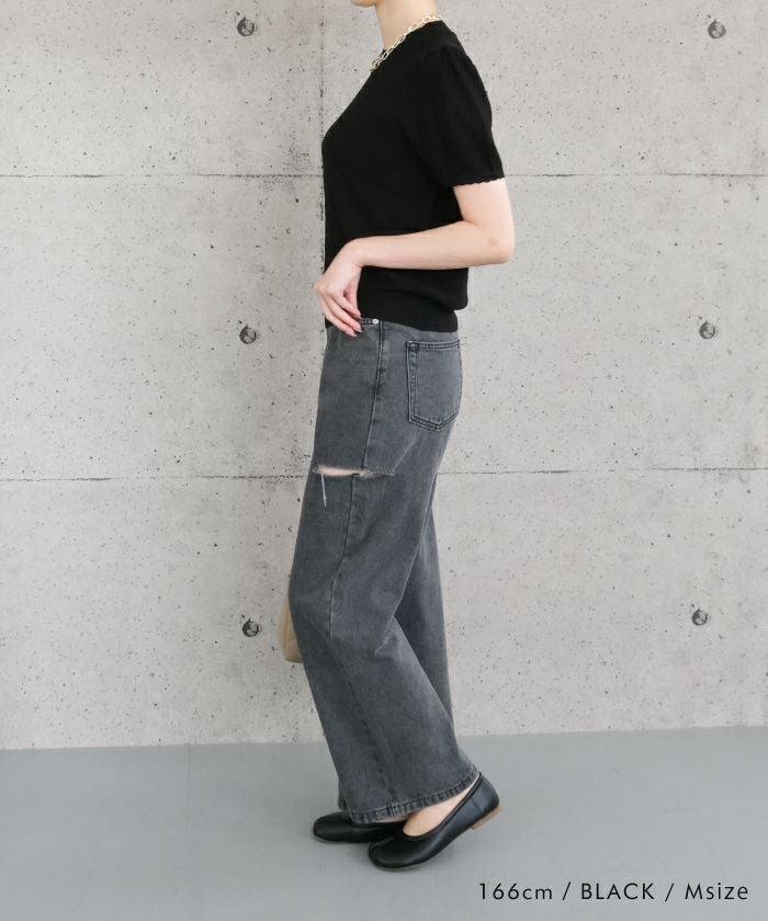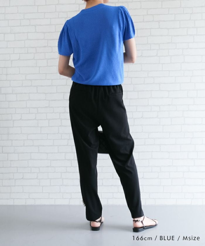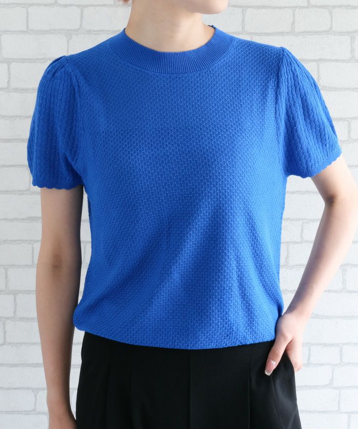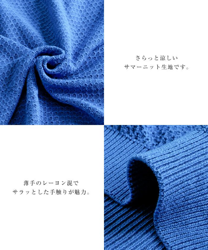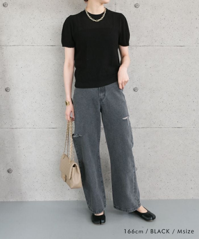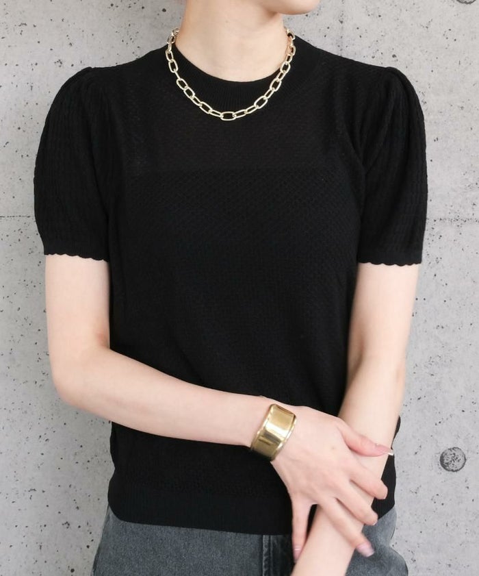 • スカラップ仕上げの袖口が女性らしい柄編みサマーニットトップス