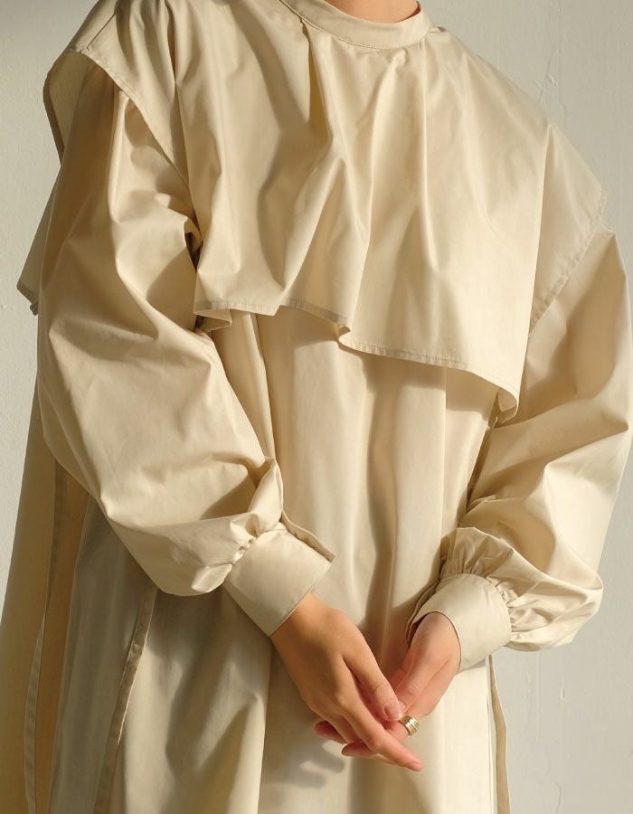 肩回りのヨーク部分に360度の贅沢なケープデザインがポイント。首元はすっきりとしたスタンドカラーがクラシカルな雰囲気を演出。前後2wayデザインでコーデの幅が広がる、大人ハンサムな1枚です ゆったりしたオーバーサイズシルエットで体型カバーにも◎