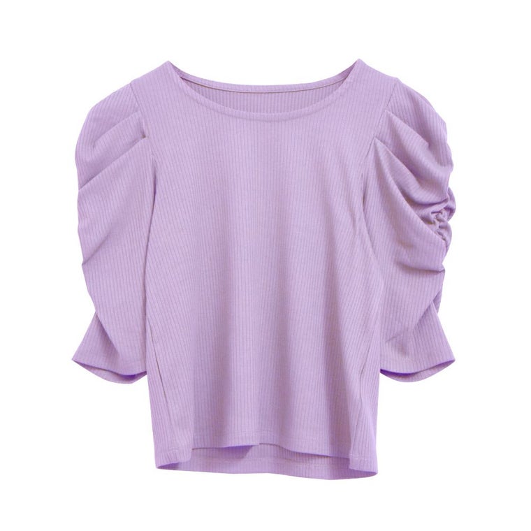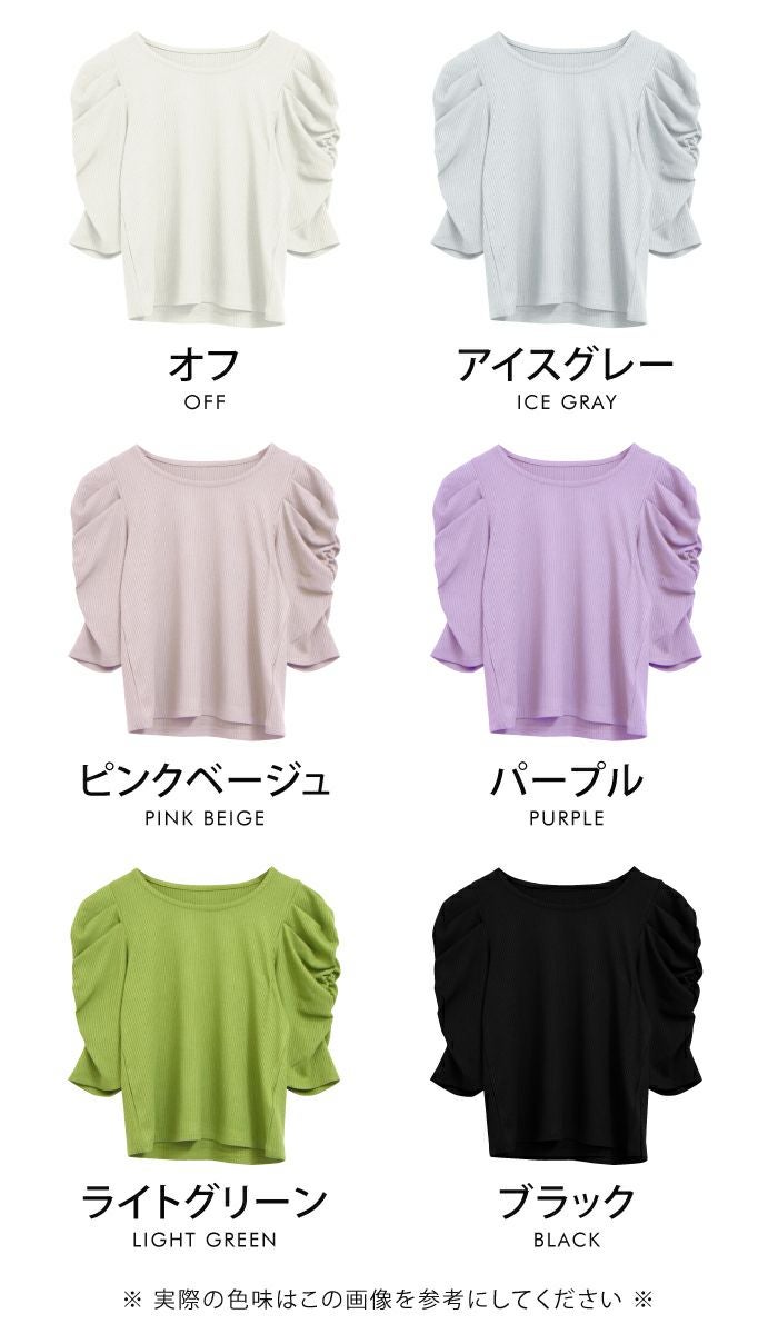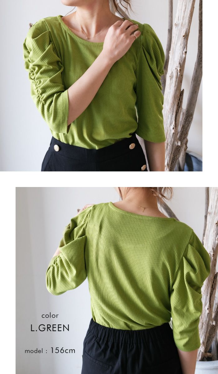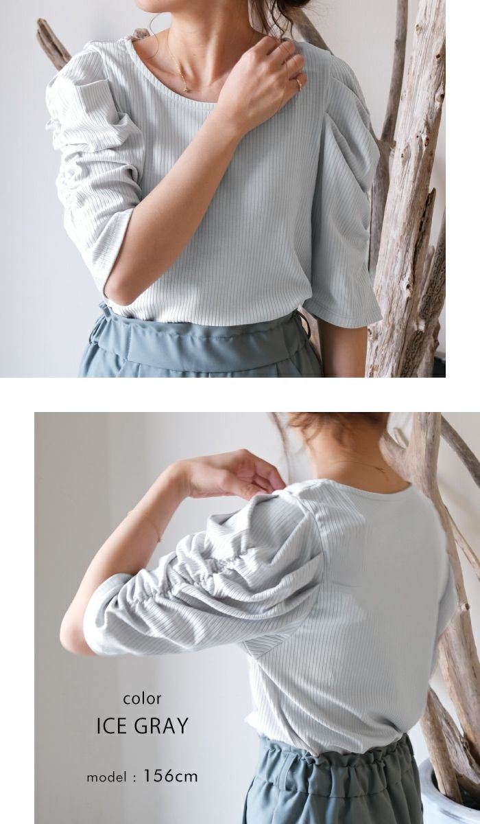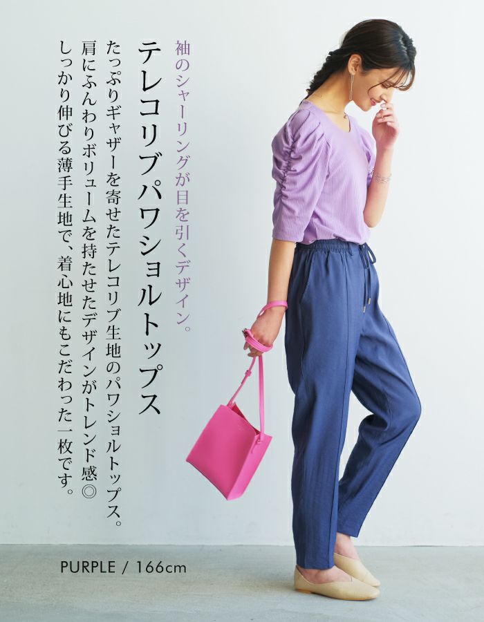 • 袖のシャーリングが目を引くデザイン。テレコリブパワショルトップス