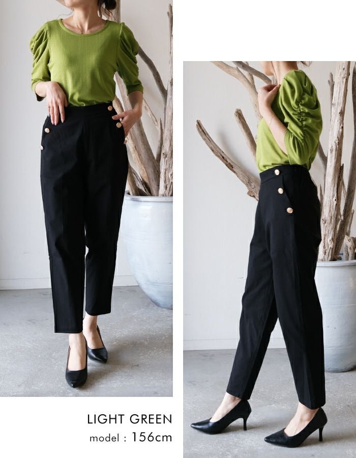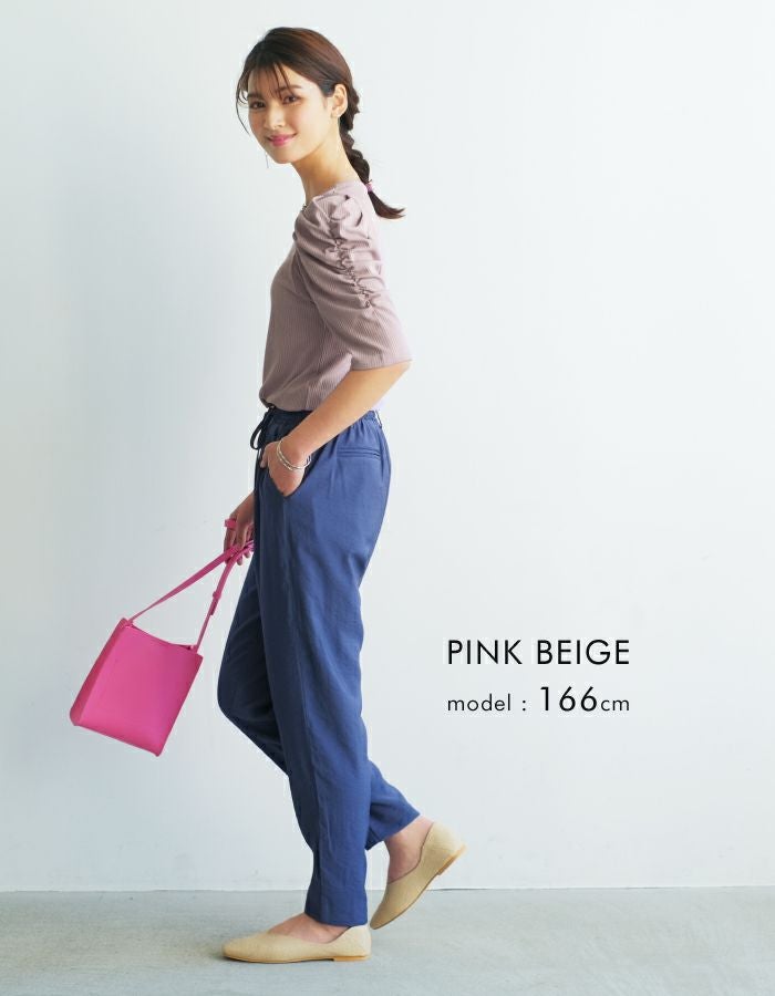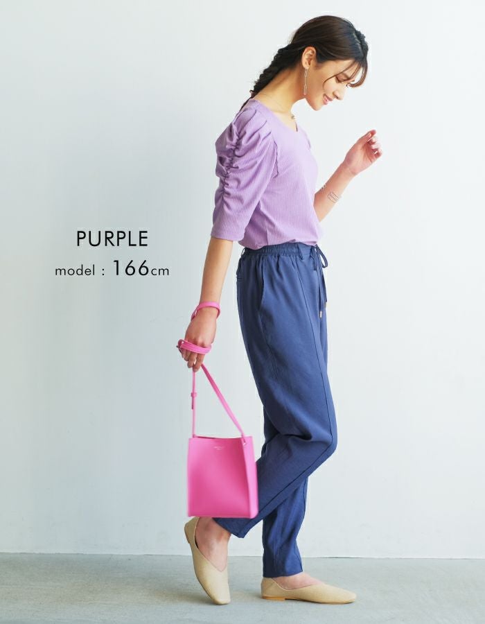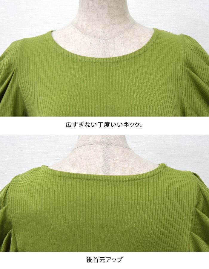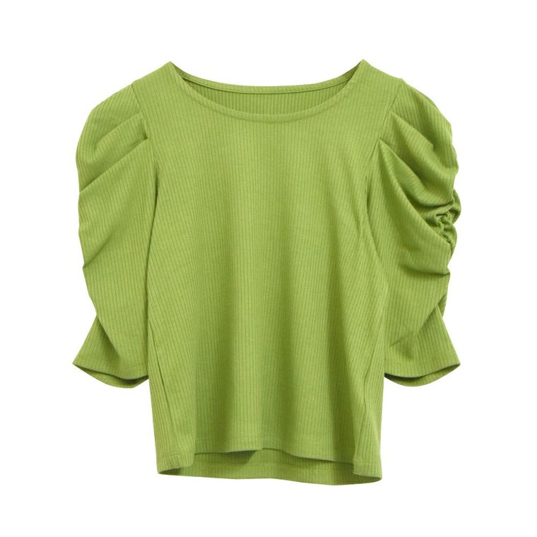 • 袖のシャーリングが目を引くデザイン。テレコリブパワショルトップス
