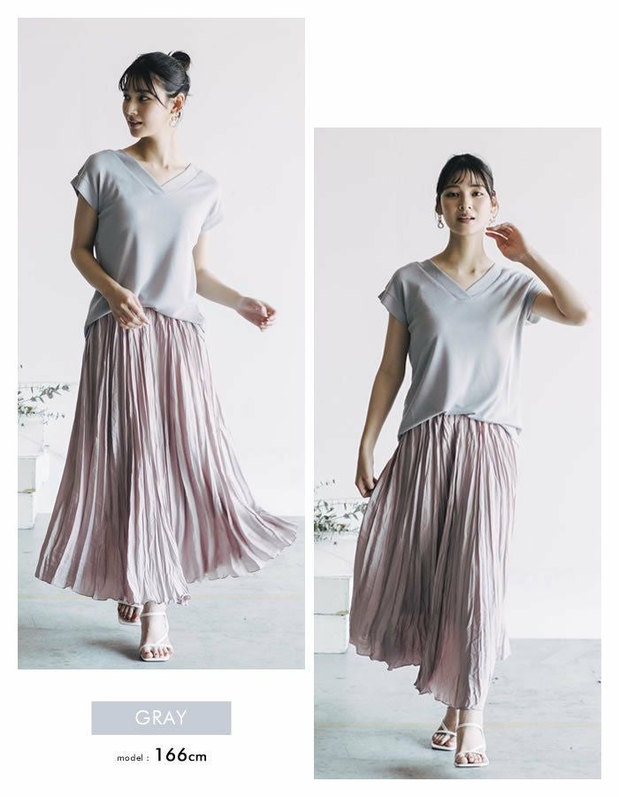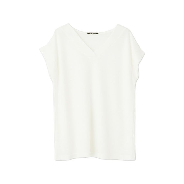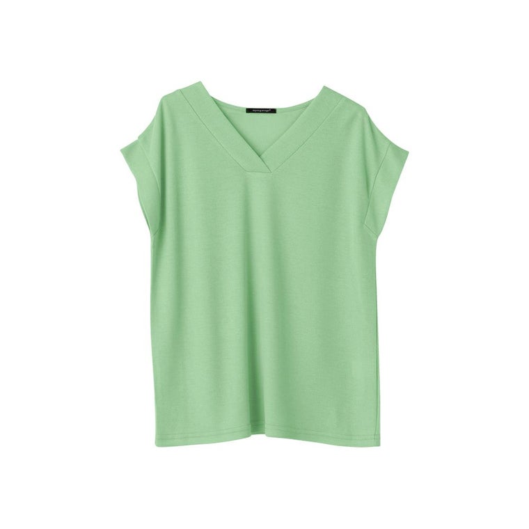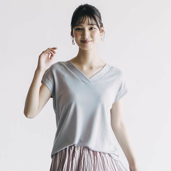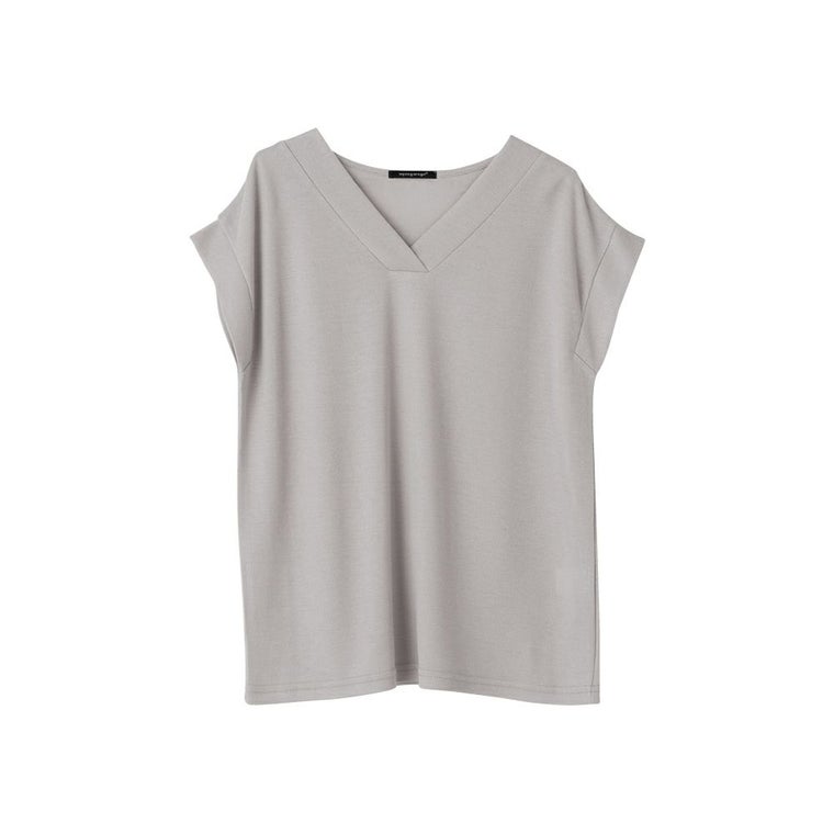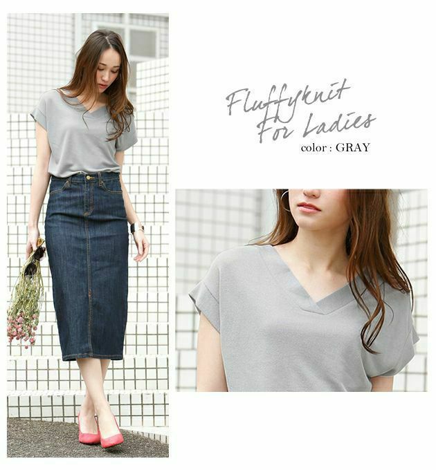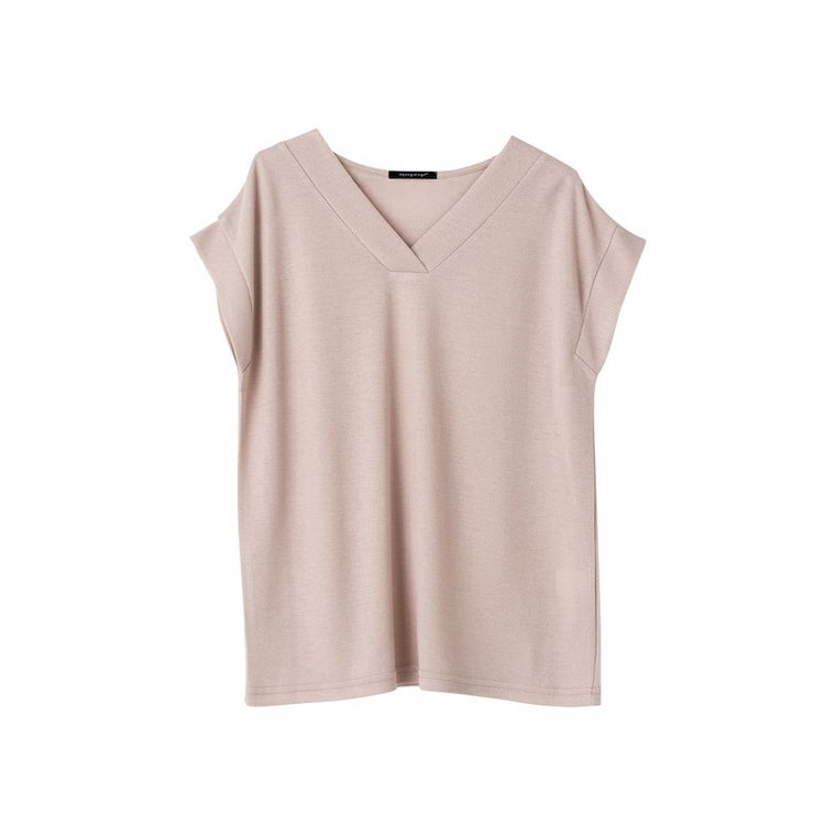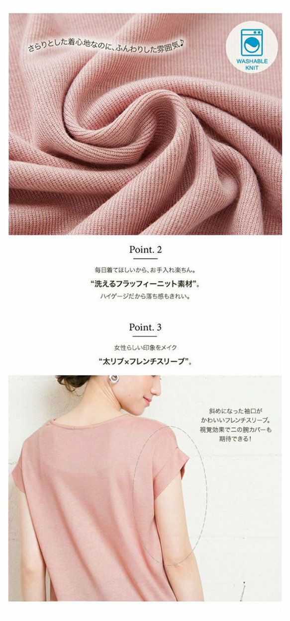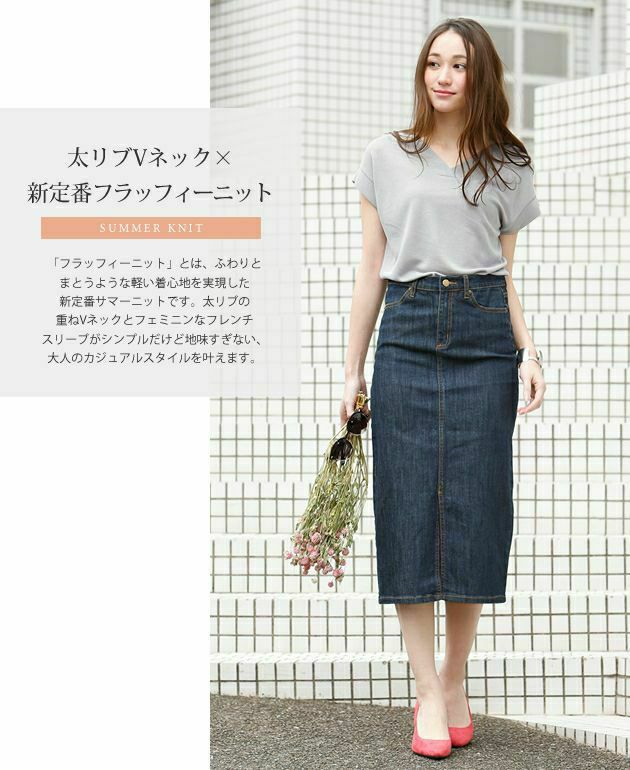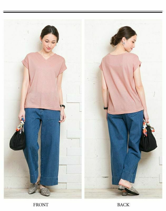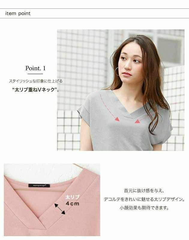 太リブの重ねVネックとフェミニンなフレンチスリーブが