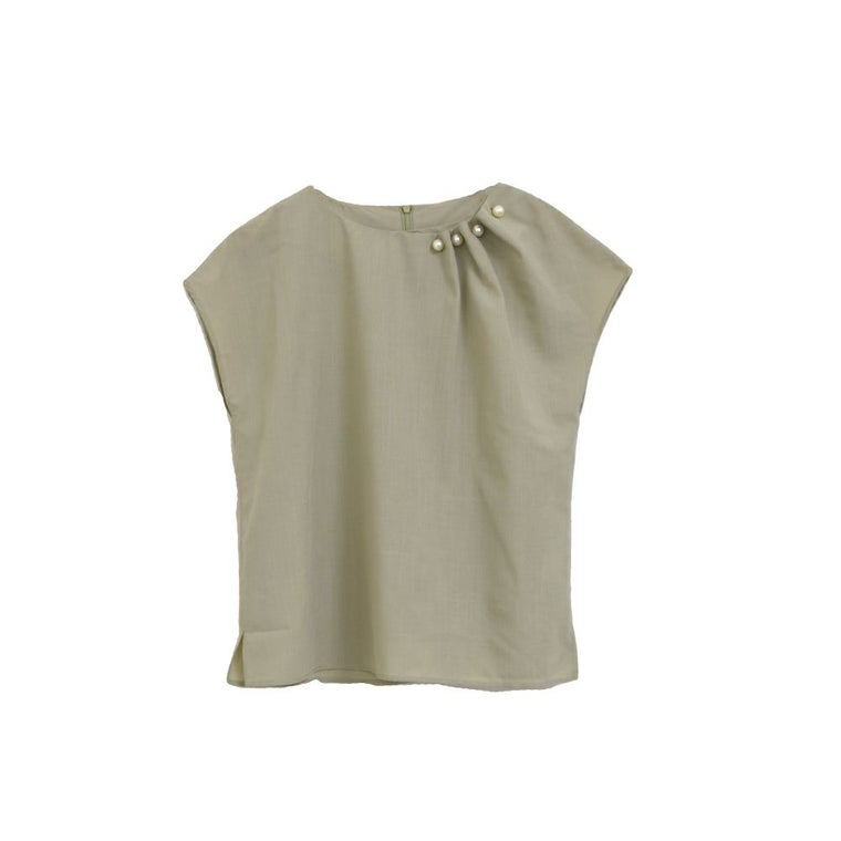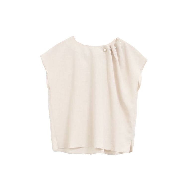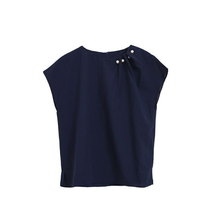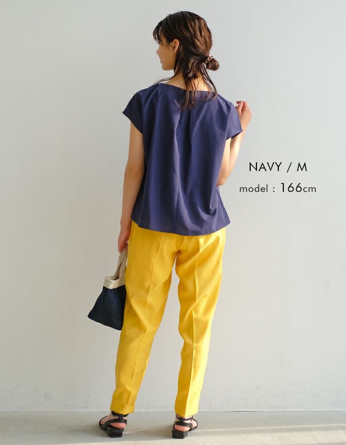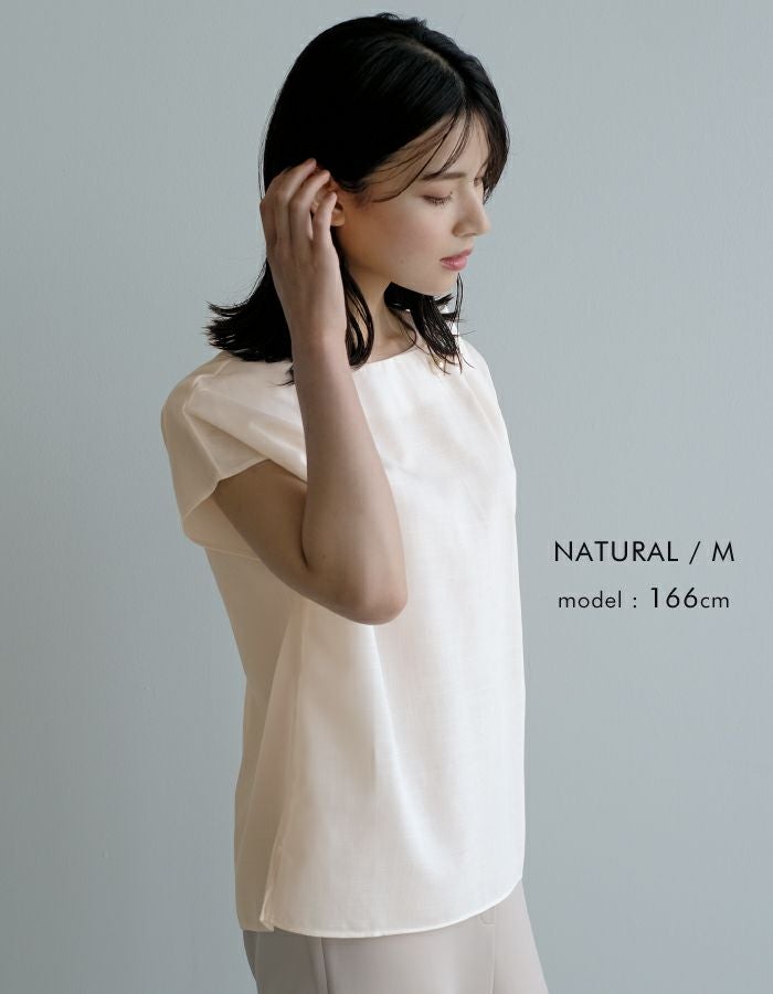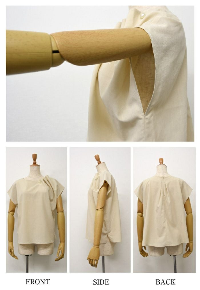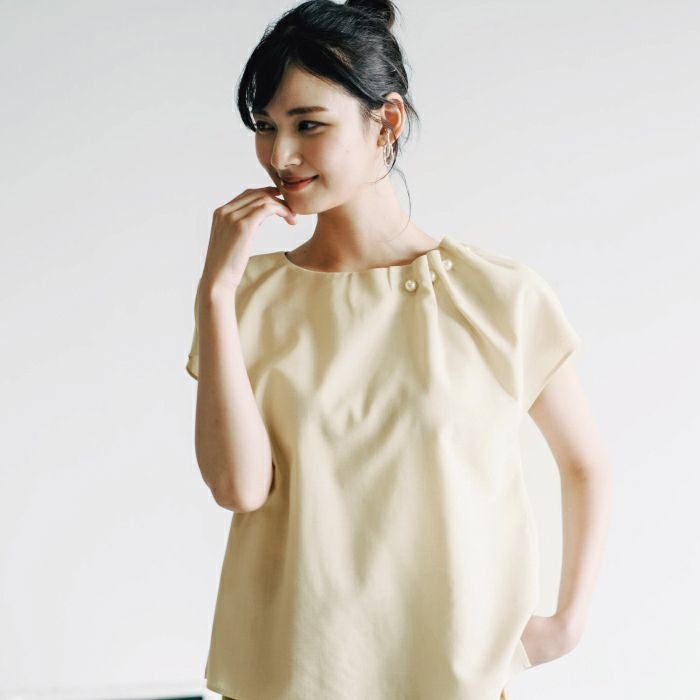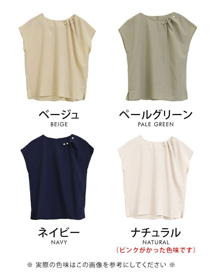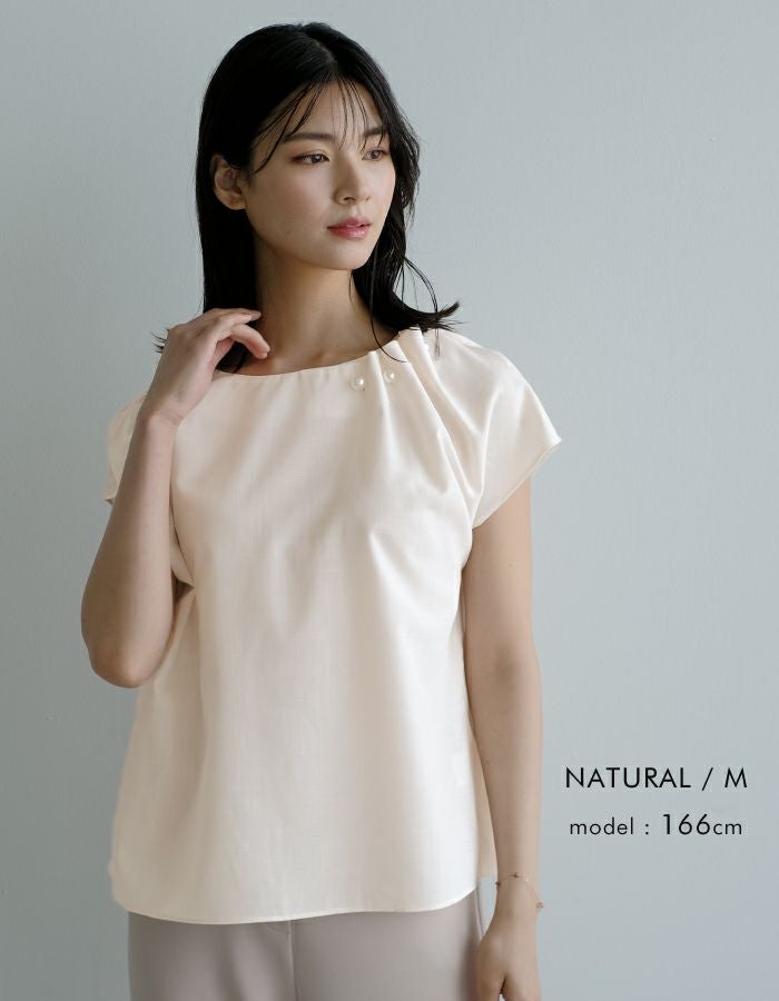 アシンメトリーにデザインされた、首元のタックとパールが目を惹くポイント。 フレンチスリーブなので、気になる腕回りもカバーしてくれます。 シンプルなコーディネートでもパールの存在感で上品かつ女性らしいスタイリングにきまります。