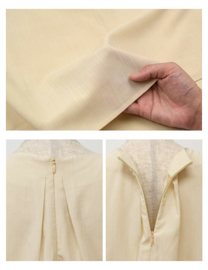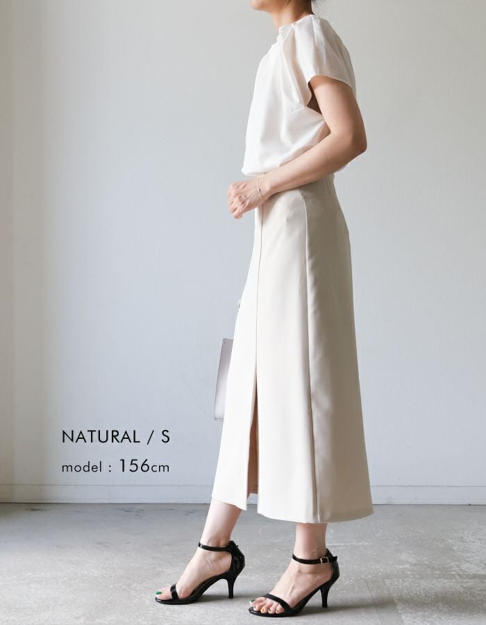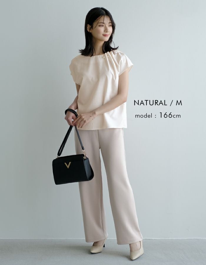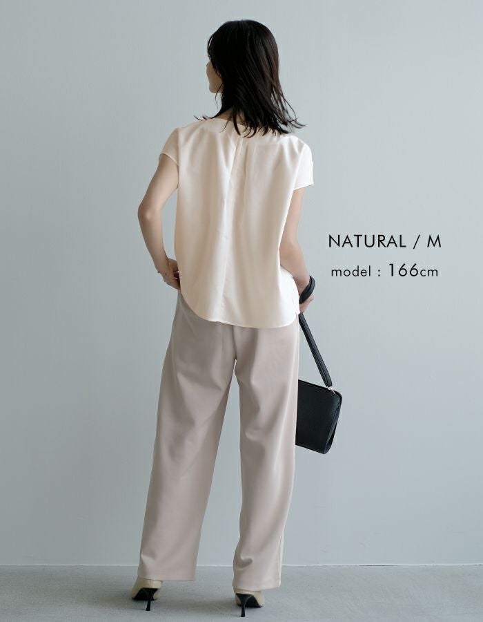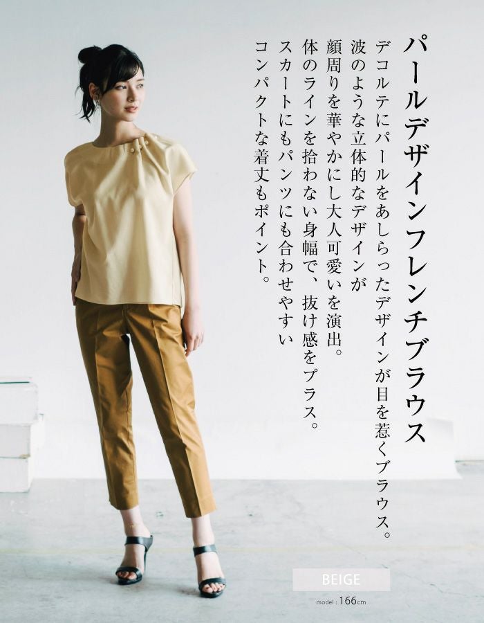 • 首元にパールをあしらったネックタックブブラウス。