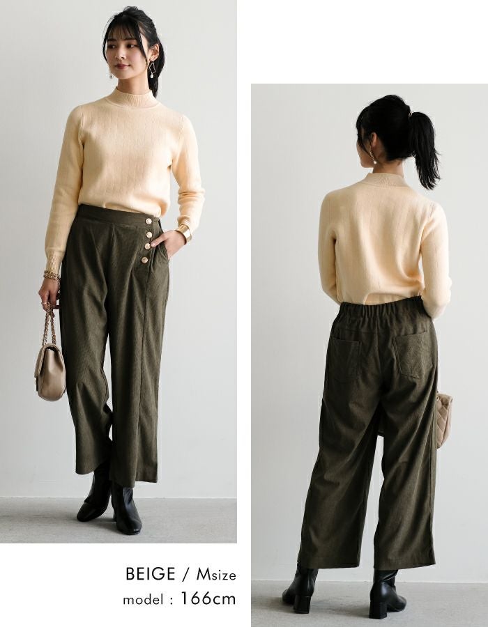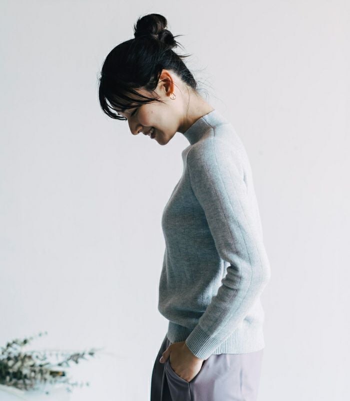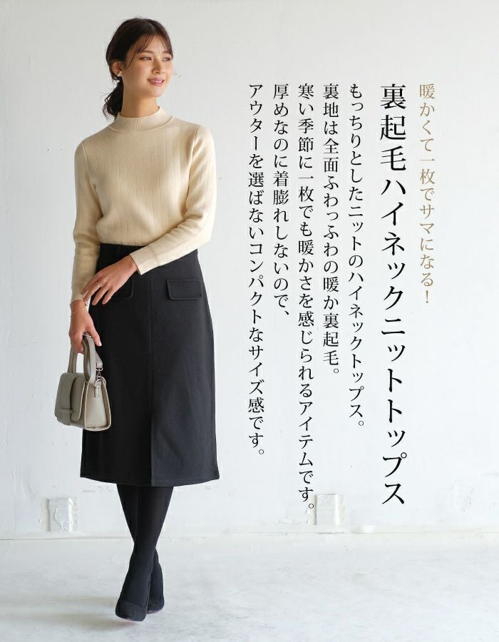 もっちりとしたニットのハイネックトップス。裏地は全面ふわっふわの暖か裏起毛。寒い季節に一枚でも暖かさを感じられるアイテムです。厚めなのに着膨れしないアウターを選ばないコンパクトなサイズ感です。