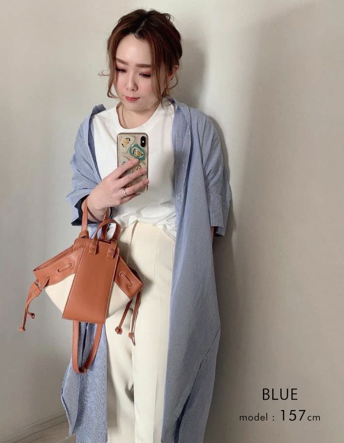 156cm肩幅広めのペラペラ体系で、ネイビー購入。生地的にはパリッとしており、真夏は暑いかもしれませんが、しっかりしています。自分の体系的には若干パジャマ感が出てしまいますが、ネックレス等の小物で合わせて着たいと思います。横のスリットのような作りもとってもかわいいです。