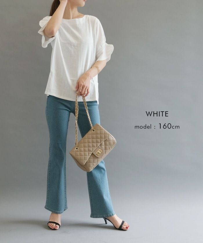 • 肩を包み込むようなフリル袖が二の腕をカバー。