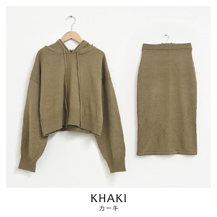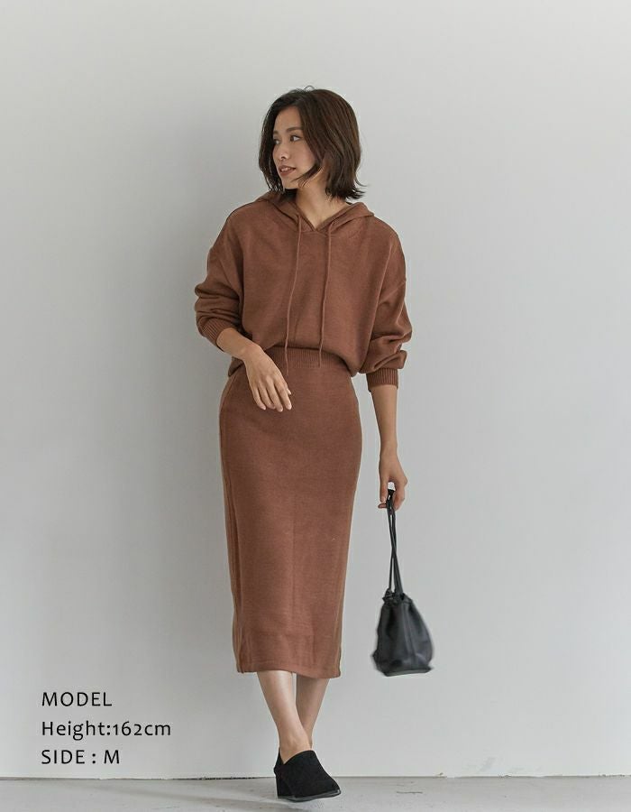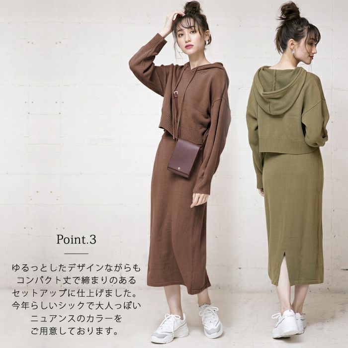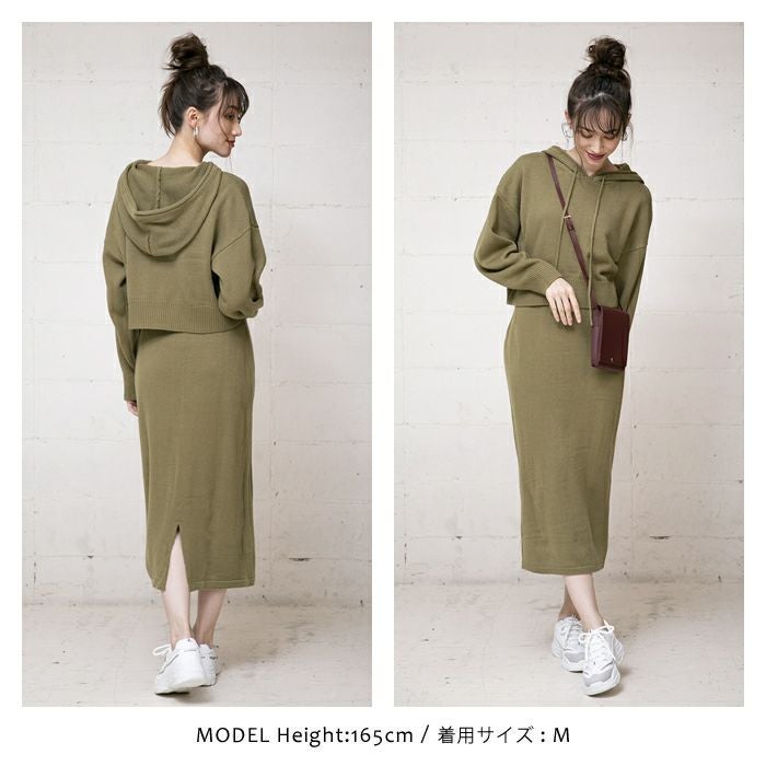 ニット セットアップ トップス パーカー フード フーディ スカート タイトスカート ゴム 伸縮 大きいサイズ 秋冬 膝下 カジュアル ゆったり リラックス ルーズ ドロップショルダー ニットアップ 19_02wrkt■