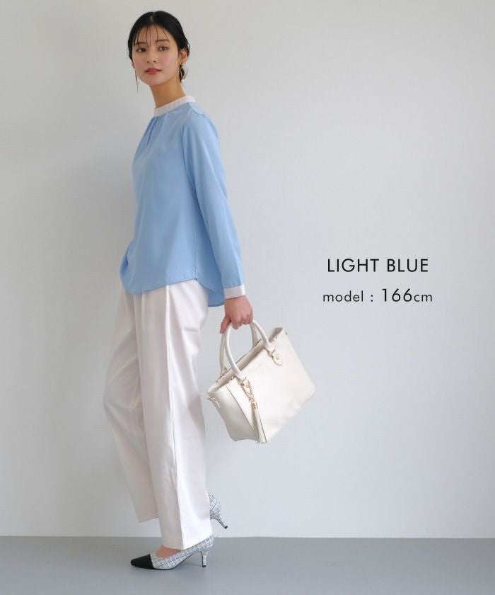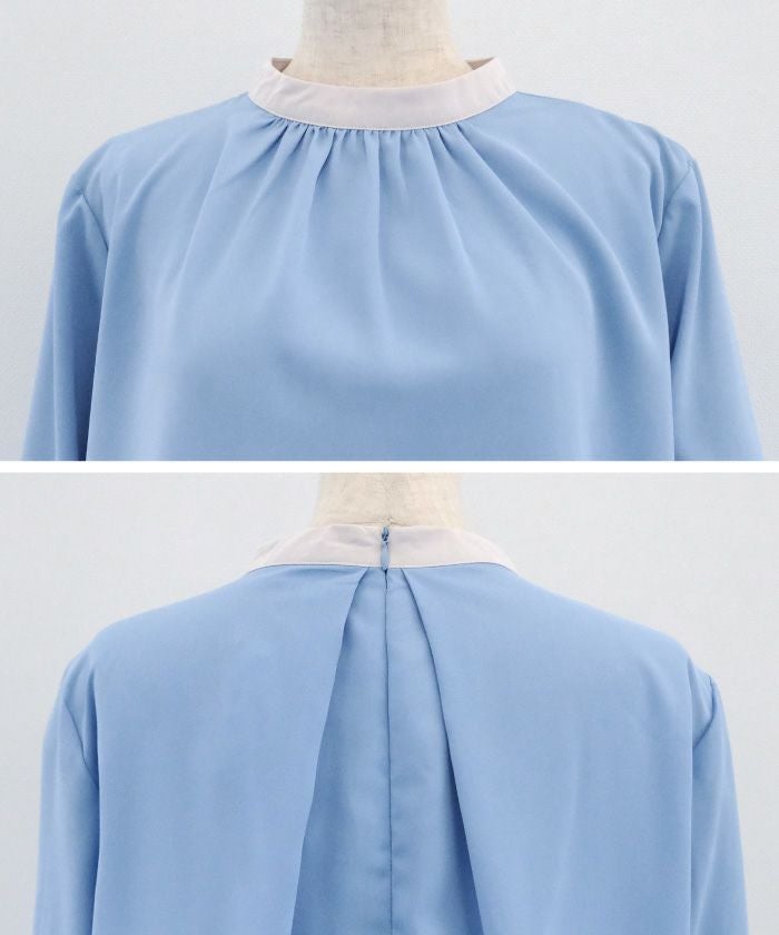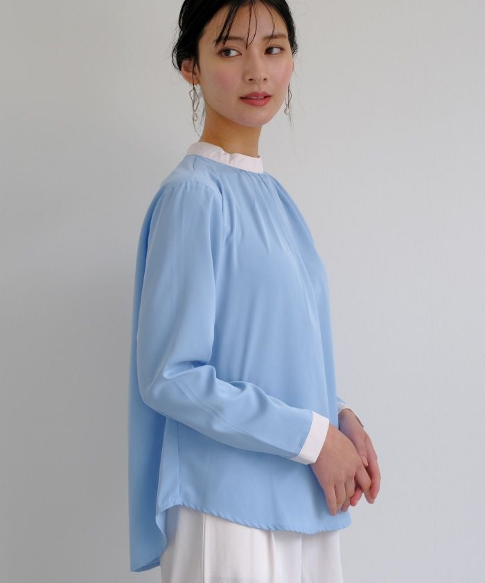 サラッとしたなめらかな肌触りのバイカラーギャザーブラウス。 首元のギャザーデザインが表情豊かなアクセントに。 深めのバックファスナーがついていて、着脱も楽なのが嬉しい。 デイリーからオフィスカジュアルまで着回し力も抜群です。