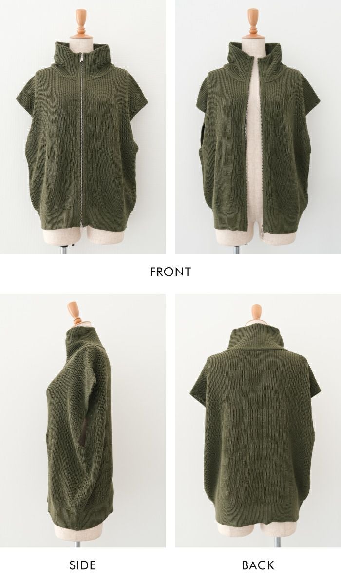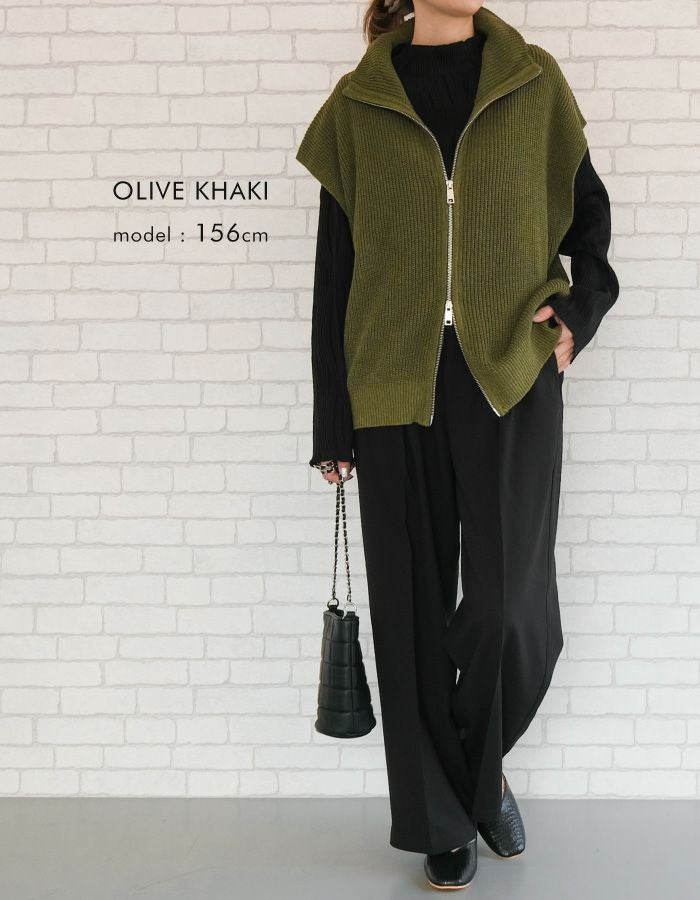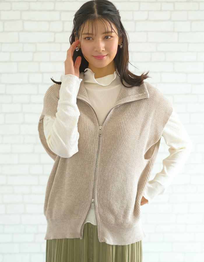 ゆったりとしたシルエットながら着やせ効果抜群のニットベスト。 チクチク感のない、肌触りのいいニット生地で着心地も抜群! 程よく肩を覆う袖丈なので、二の腕も華奢に見せてくれます。 着丈はヒップにかかる長さがあり、気になる腰回りもカバー ◎ ジップは上下に付いていて、お好みスタイリングに調節可能です。 合わせ方次第でロングシーズン活躍してくれるアイテムです。