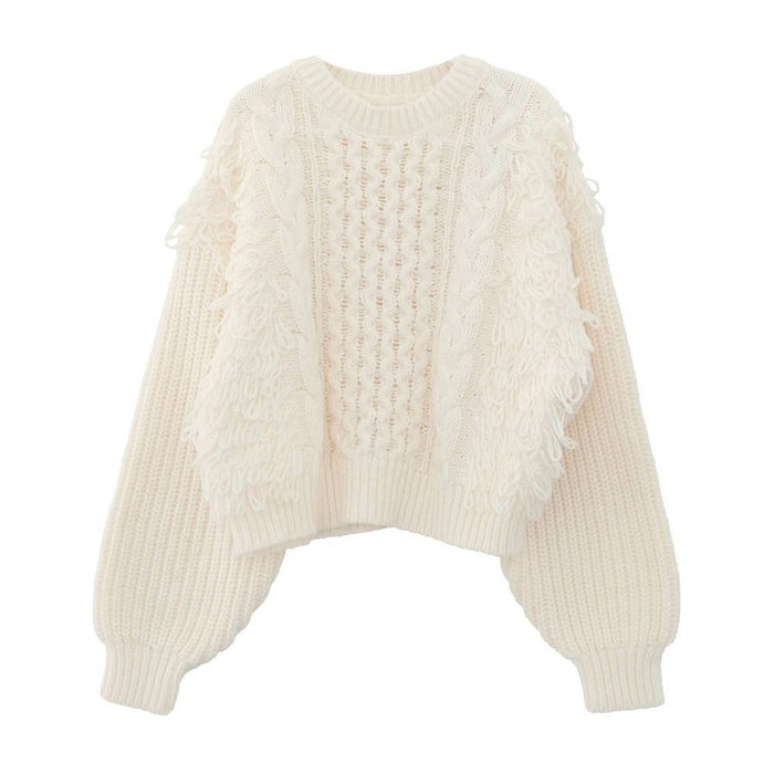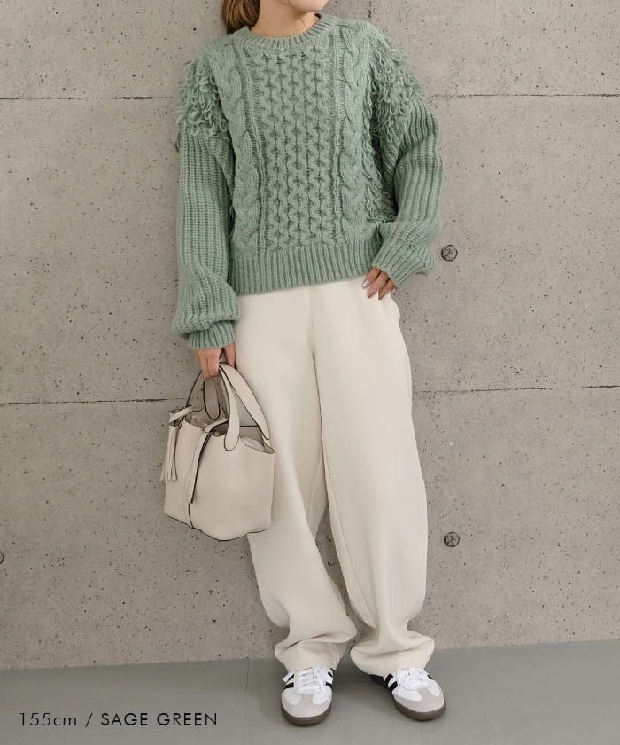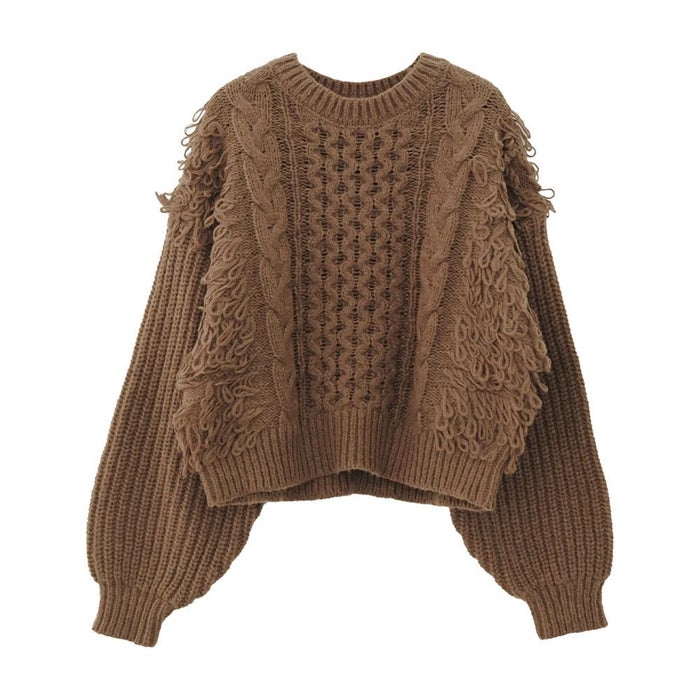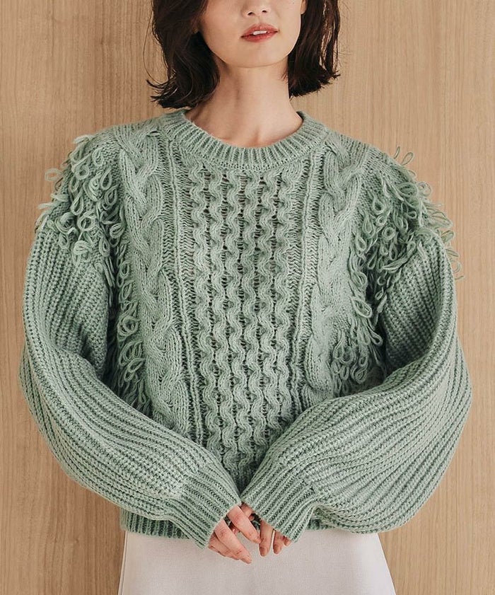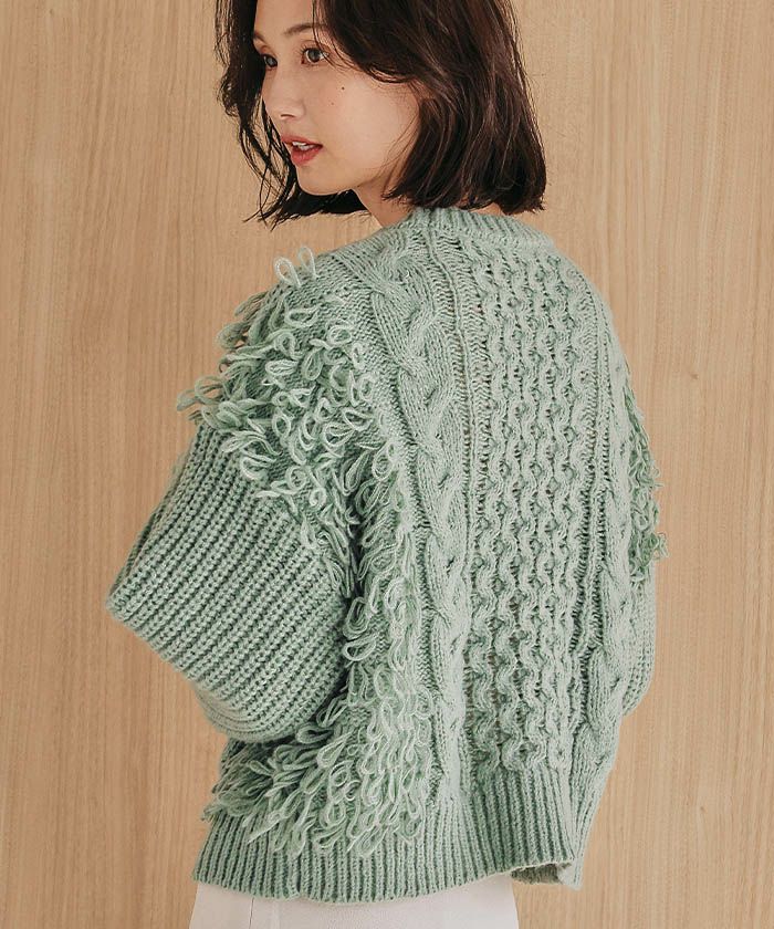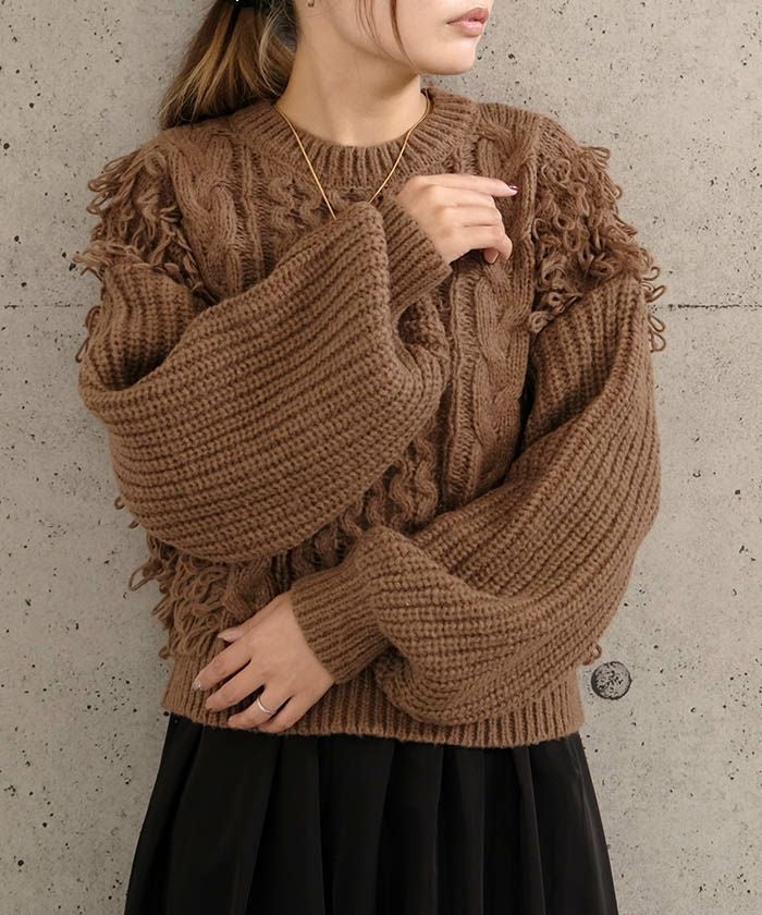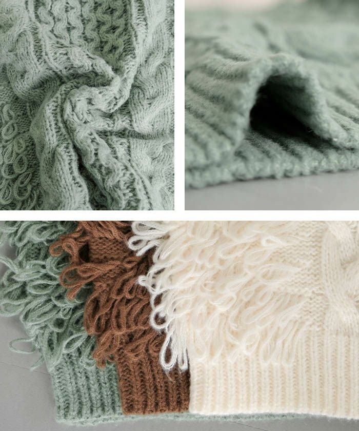 ケーブル編みとループフリンジの組み合わせが立体的な表情を作り、