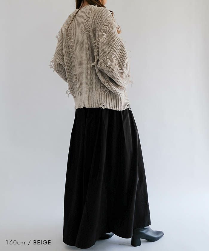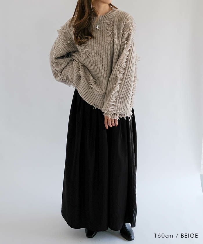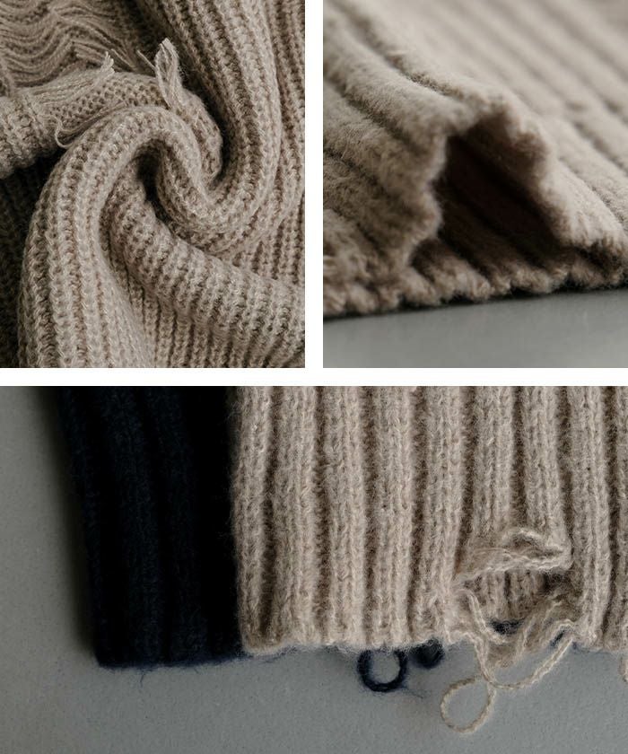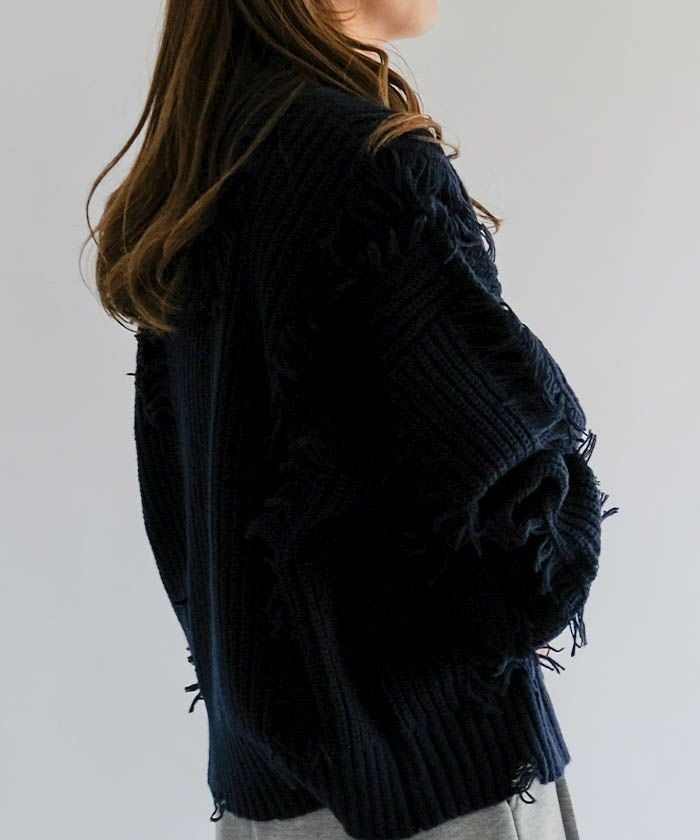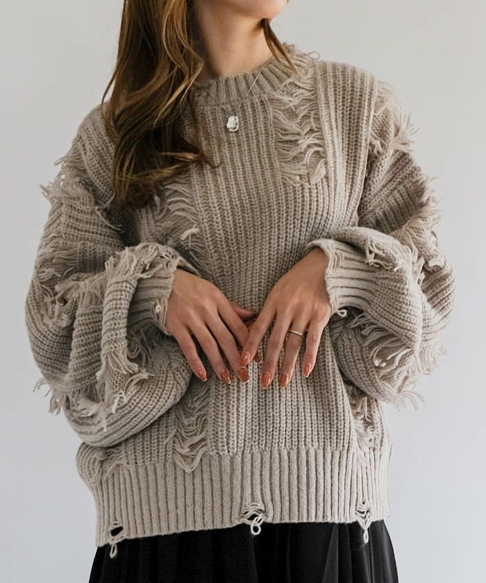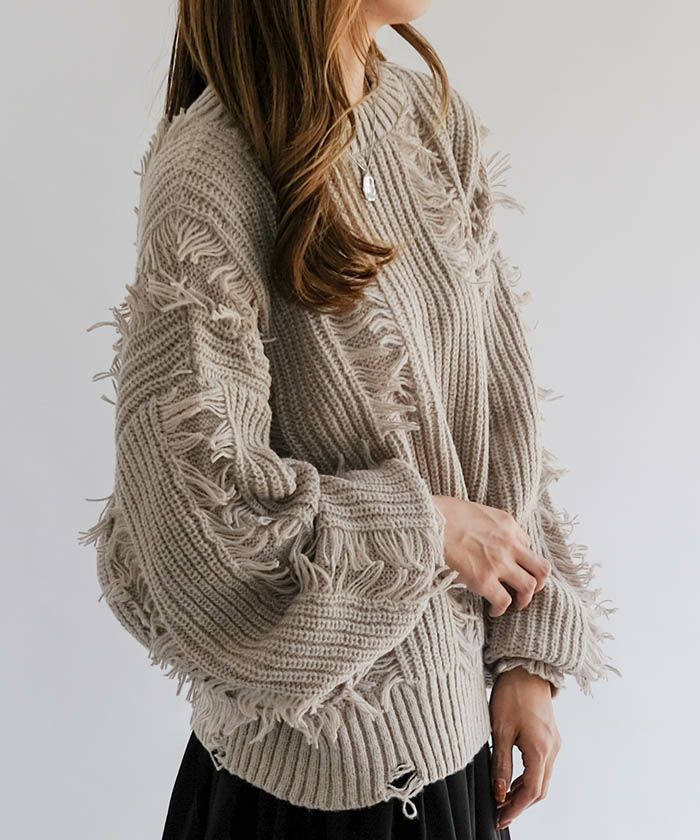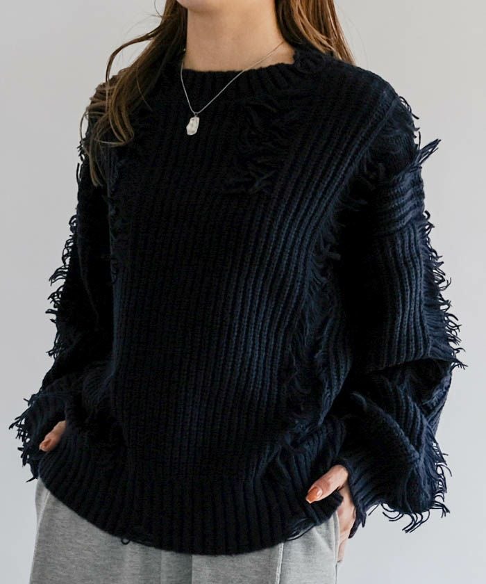 シンプルなニットに、遊び心のあるダメージ加工とフリンジディテールをプラスした、大人のカジュアルスタイルにぴったりの一枚です。