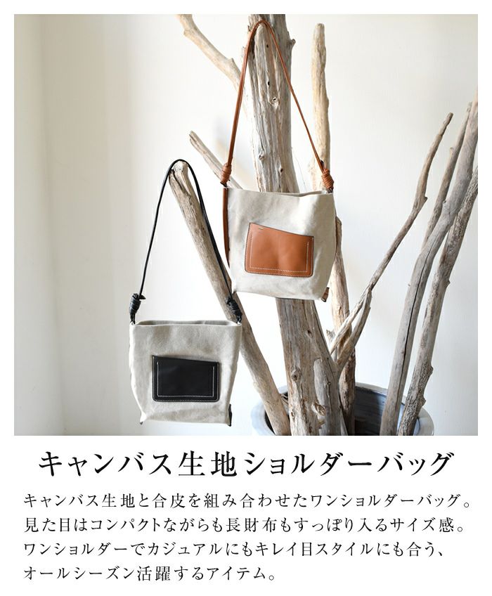 • キャンバス生地と合皮を組み合わせたワンショルダーバッグ。