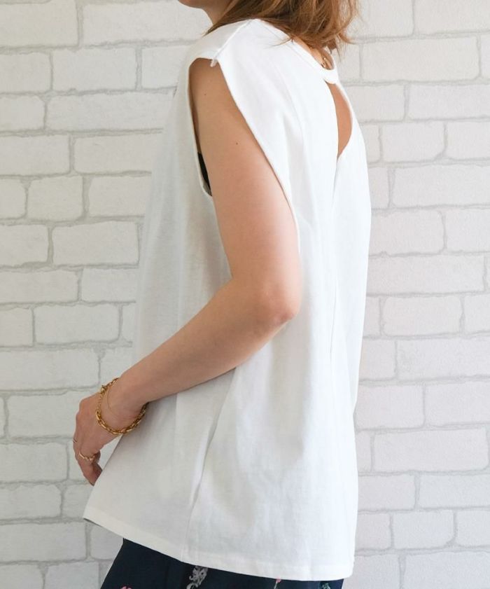 さりげないアクセントを加えたバックデザインが魅力のノースリーブカットソー。