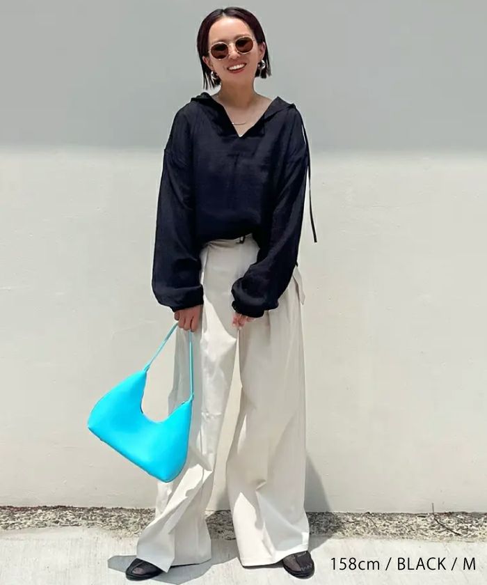 普段M〜Lを着用。 今回Mサイズのカラーはホワイトを購入。 シアー素材というとフードがないタイプのシャツやジップアップパーカータイプのものは良く見かけたのですが、こちらの珍しいプルオーバータイプのシアーパーカーには一目惚れしてしまいました。 柔らかさとハリ感、透け感が程よくて、スタイリングに軽さをプラスしてくれます。ふわっとしたシルエットが今っぽいリラックスした雰囲気を作り出します。 普段はMもLも着ますが、身長150cm程度のため、今回はMサイズ購入。 決してきついことはない、ゆったりジャストという感じでした。身長の高い方やもっとカジュアルテイストに仕上げたい時にはLサイズも良いのかなと思いました。 ホワイトはふんわり涼しげや雰囲気に。追加でシックなブラックやカーキも欲しくなるような素敵なパーカーです♪