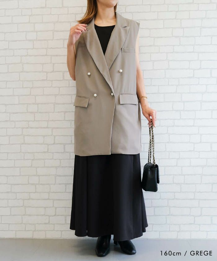 • パールボタンがポイントの定番のロング丈テーラードジレジャケット。
