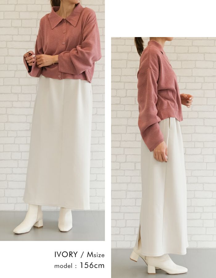 落ち感のあるやわらかなダンボール素材のナロースカート。 センターシームとIラインシルエットで、縦長ラインを強調◎ 深めのベンツスリットが入っていて動きやすいのも嬉しいポイント。 ウエストは全体的に伸縮性があり楽ちんな穿き心地です! シンプルで着回しやすい、デイリーユースに活躍するアイテムです。