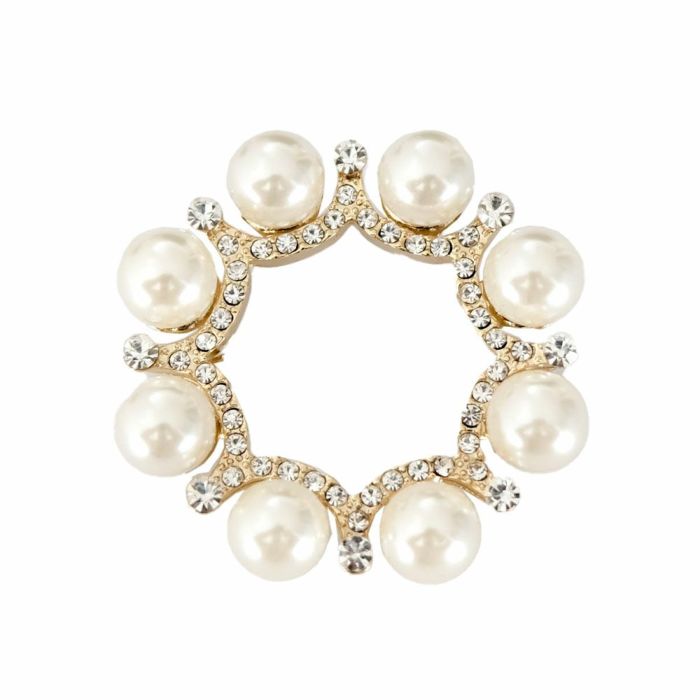 • まるで優雅なサークルダンスを踊るように並んだパールとクリスタルの輝きが印象的なゴールドブローチ。