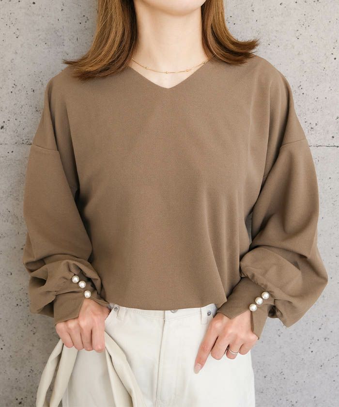 送料無料 梨地Vネック袖口パールカットソー レディース 春 秋 冬 M ≪ゆうメール便配送30・代引不可≫| アクアガレージ aquagarage