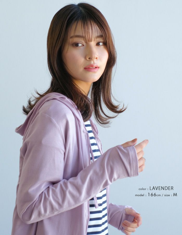 日差しからお肌を守りつつお洒落で気軽に羽織れるパーカー。 指穴付きで手の甲までしっかり隠れるのもポイントです。 UVカット・冷房対策や、羽織るだけでひんやりとする接触冷感仕様! 通勤・通学や野外イベントでも大活躍な1枚です。