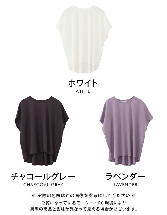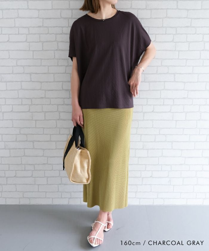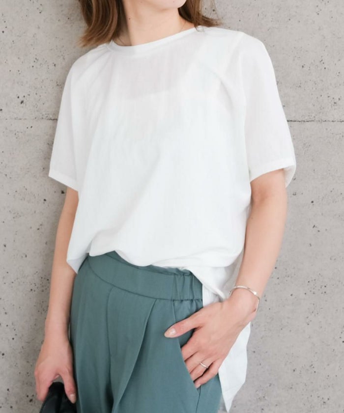 体のラインを拾わない余裕のあるシルエットを作り上げ、気になる二の腕をしっかりカバー。