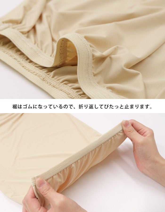 ボトムの裾がトイレの床につくのを避ける為に生まれたペチパンツ。 裾にゴムが入っているので、一緒に折り返して固定しておけます。 透け、張り付きも防いで、静電気防止もしてくれる優秀アイテムです!